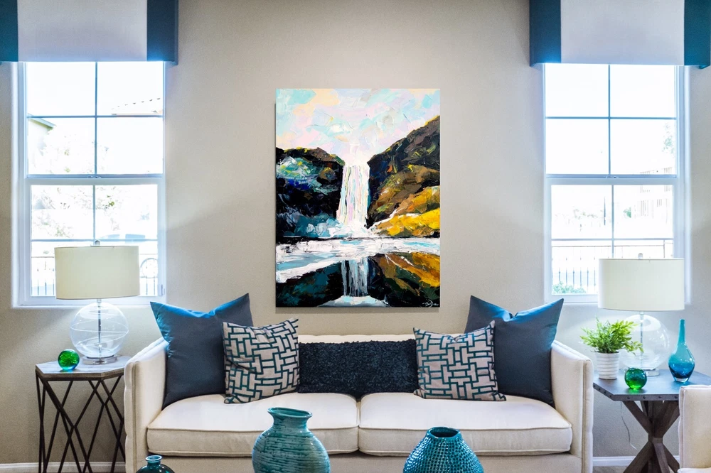 This painting is a journey for those who love to excel. A brutal vacation in rough boots and jackets with fur, or an interesting journey with loved ones filled with new discoveries and excellent views from the mountains to wild waterfalls and mirror reflections in the water. If you look closely, the waterfall shimmers in many shades, reflecting the rich sky in the seemingly cool climate. -ORIGINAL painting. This is not a copy or print. -Professional quality artists light fast acrylic paints on canvas using a palette knife. -Signature on the front and on the back. -Size: 70*50 cm. / 27.5x19.6" inches -Free shipping with tracking number west landscape painting,canvas impasto painting,3d painting,volumetric painting,mountains painting,waterfall canvas painting,wall art,original canvas painting,acrylic landscape painting,original art,original painting,palette knife painting,national park painting,north painting