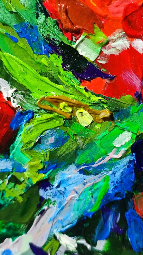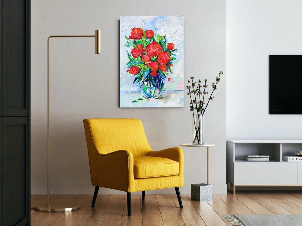 This picture seems to be inspired by nature itself and the splendor of its flowers. Charming red flowers immersed in lush green leaves create an indescribable impression of picturesque beauty and vitality. The impasto technique, with its rich, voluminous brush strokes, gives this painting tactility and texture, as if you can feel each stroke, as if touching flower petals. This art comes to life before your eyes, as if the flowers have just been cut from the garden and placed in a clear glass vase. Looking at this picture, you not only see beauty, but also feel its smell and freshness. It brings bright colors and positive emotions into your space, filling it with living natural beauty. This work of art will not only become part of your interior, but also a source of inspiration and joy every day. -ORIGINAL painting. This is not a copy or print. -Professional quality artists light fast acrylic paints on canvas using a palette knife. -Signature on the front and on the back. -Size: 70*50 cm. / 27x20" inches -Free shipping with tracking number Good vibes painting, optimistic painting, red flowers painting,canvas impasto painting,wall art,living room painting,kitchen painting,red flowers in vase painting,red bouquet painting,flowers art,flowers still life painting,flowers impasto painting, still life painting, bedroom painting, 3d wall art, focus on the good painting, kitchen flowers painting