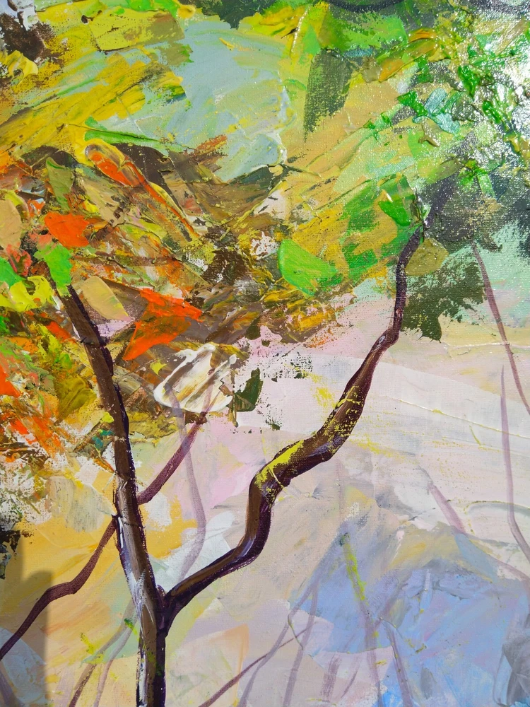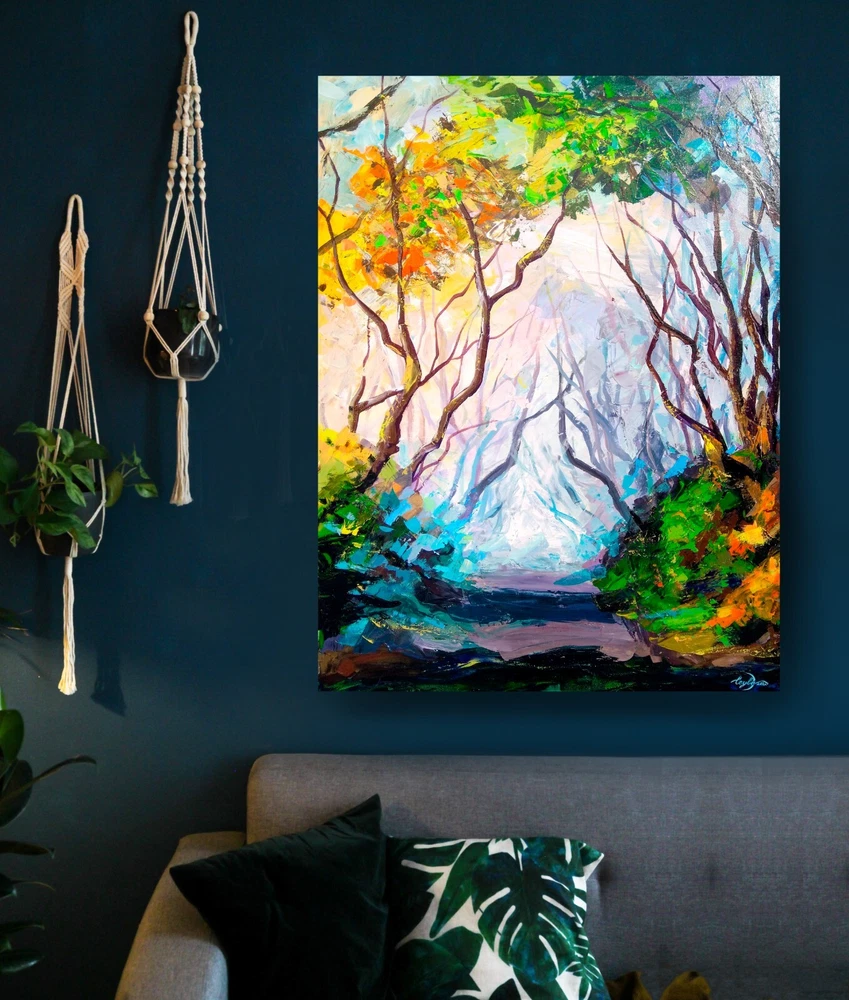 This stunning piece of art is a one-of-a-kind original acrylic painting titled "Attraction of the unknown". Created by the talented artist Leyla Zhunus, this contemporary artwork features a beautiful forest scene with trees and seasons. The painting is done on a medium-sized canvas using an impasto technique with a palette knife.The piece is signed by the artist and is unframed, allowing for personalized framing to match any décor. This handmade painting is perfect for nature, art, nautical, Americana, amusement parks, and tourism enthusiasts. With its unique theme and impressive production technique, this painting is a must-have for any art lover. -ORIGINAL painting. This is not a copy or print. -Professional quality artists light fast acrylic paints on canvas using a palette knife. -Signature on the front and on the back. -Size: 60*80 cm. / 31*23 inches -Free shipping with tracking number