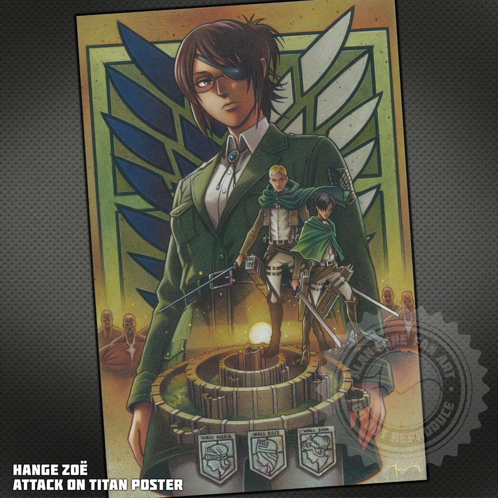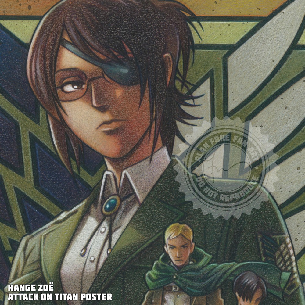 • FREE US SHIPPING ON ALL ORDERS • I ship all orders within a week, most in just a couple days. • 12x18 inch poster of Hange Zoe from Attack on Titan. • Makes a great gift for any Attack on Titan fan! • A unique item to get signed by the voice actors. • Ships in sturdy packaging to keep the set in mint condition on it's way to you. • Printed on a high-quality commercial press on thick, matte cover stock. This high-quality 12"x18" Hange Zoe movie poster-style print features Hange Zoe, Levi Ackerman and Erwin. Each poster features highly detailed original artwork and makes a perfect gift for any fan of the Attack on Titan Anime. The poster was produced by a local commercial press on thick, matte cover stock. ------------------------------------- I'm a working artist. This is what I love and it's how I make my living. I take great pride in each and every piece I offer for sale and I know you're going to love it as much as I do. If you're interested in commissioning a custom project, please send me a message through eBay or Instagram. You can also follow me on Instagram @PortraitsByAlan for a sneak peek at new projects, works in progress and behind the scenes photos.