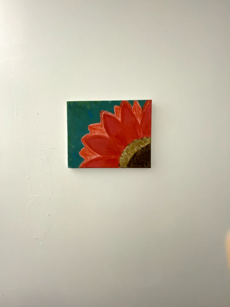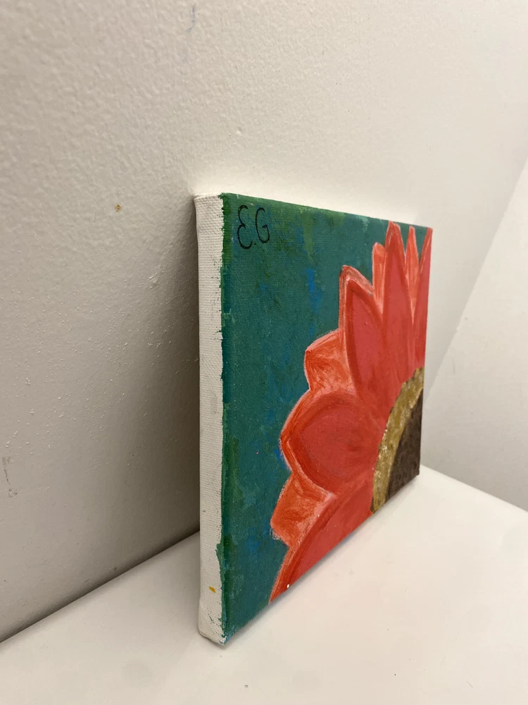 Pink sunflower painting with a green background. Original, handmade botanical inspired wall art. Dimensions: 10" x 8" canvas used.