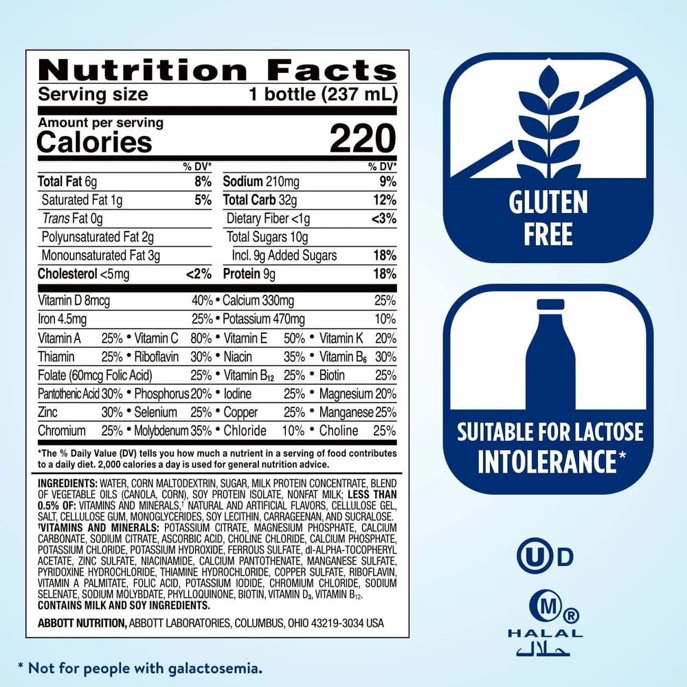 eBay Product details Ensure Original nutrition shakes have 9 grams of protein and 27 vitamins and minerals. Ensurenutritional shakes support immune health by supplying protein, vitamins A and D, zinc, andvitamins C and E. These shakes are kosher, halal, and suitable for lactose intolerance.** Not for people with galactosemia. COMPLETE, BALANCED NUTRITION: A comprehensive blend of protein, fat, carbohydrates, and essential vitamins and minerals IMMUNE SYSTEM SUPPORT: An excellent source of zinc, vitamin A, and antioxidants—vitamins C & E and selenium—for immune system support 27 VITAMINS & MINERALS: To support muscle, heart, and bone health, & energy GREAT TASTE: A delicious source of protein, you can enjoy it as a small meal replacement, with a meal, or as a snack #1 DOCTOR-RECOMMENDED: Ensure, the brand for strength and energy, is also the brand recommended most by doctors who suggest nutritional drinks to their patients