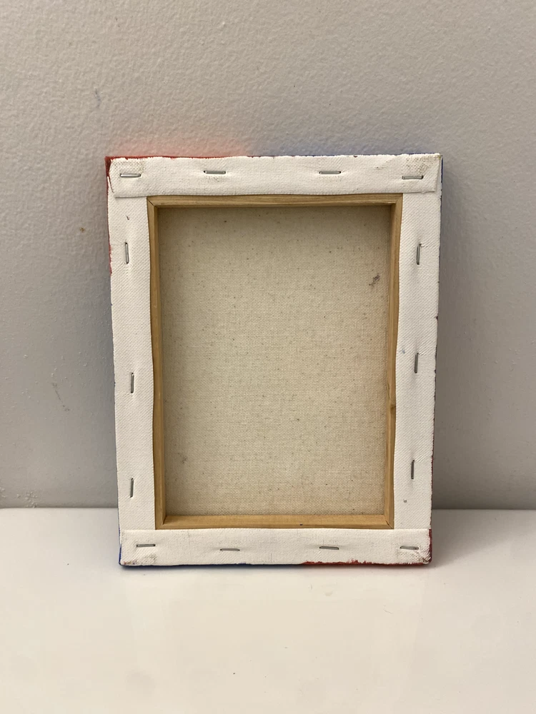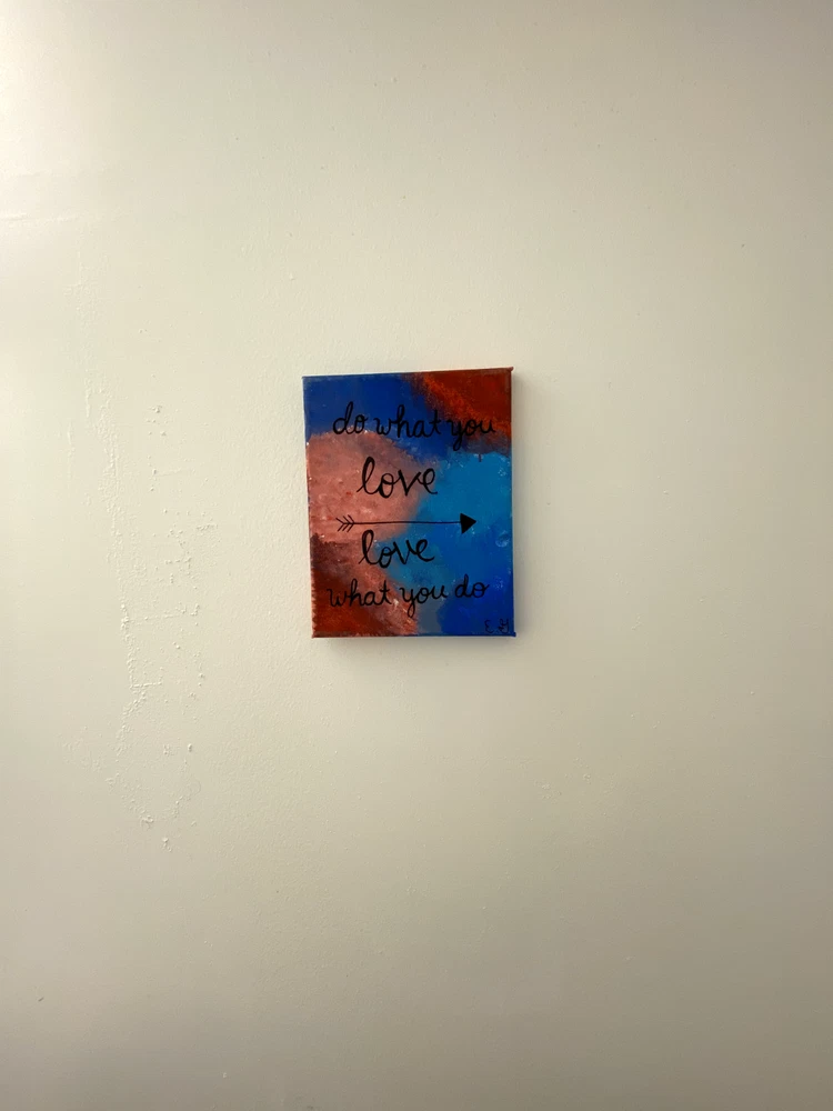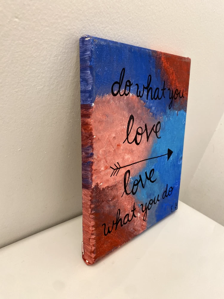 "Do what you love, love what you do" inspirational quote acrylic painting on canvas. Red, blue, and pink color themes, with cursive lettering. Dimensions: 7" x 9" canvas used.