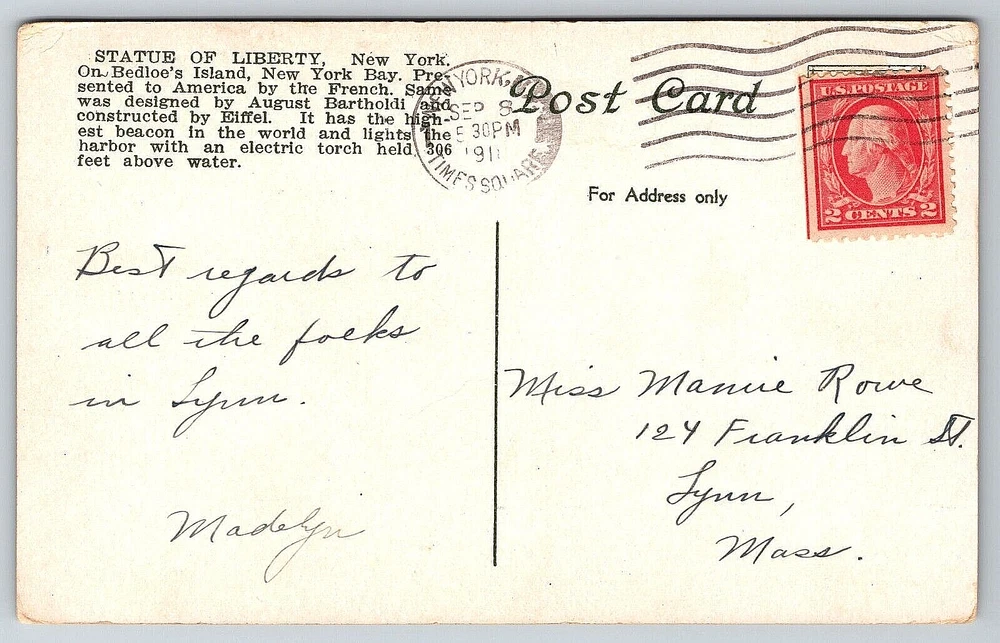 Seller Notes: “Good Vintage Condition.” Country: United States Character: Postcard Number of Items in Set: 1 Type: Mail Old Genuine Original Postcard Card Image Picture Antique Finish: Matte Orientation: Vertical Franchise: Postcard UPC: DOES NOT APPLY Signed By: Sender Signed: Yes Material: Paper Continent: North America City: New York City Country/Region of Manufacture: United States Artist: Postcard Stamp: Yes Color: Multicolor Theme: Architecture, Cities & Towns, Community Life, Domestic & Family Life, Famous Places, Historical Figures, Landscapes, Nautical, Patriotic, Roadside America, Seasons, Social History, Tourism Postage Condition: Posted gtin13: DOES NOT APPLY Featured Person: None Posted: Yes Year Manufactured: 1911 Brand/Publisher: Unbranded Unit of Sale: Single Unit Subject: Statue Vintage: Yes Occasion: Postcard Features: Divided Back, Stamp, Stamped, White Border, Original Genuine Antique Vintage Postcard Era: Divided Back (1907-1915) Size: Standard (5.5 x 3.5 in) Original/Licensed Reprint: Original Antique: Yes Region: New York Time Period Manufactured: 1900-1919