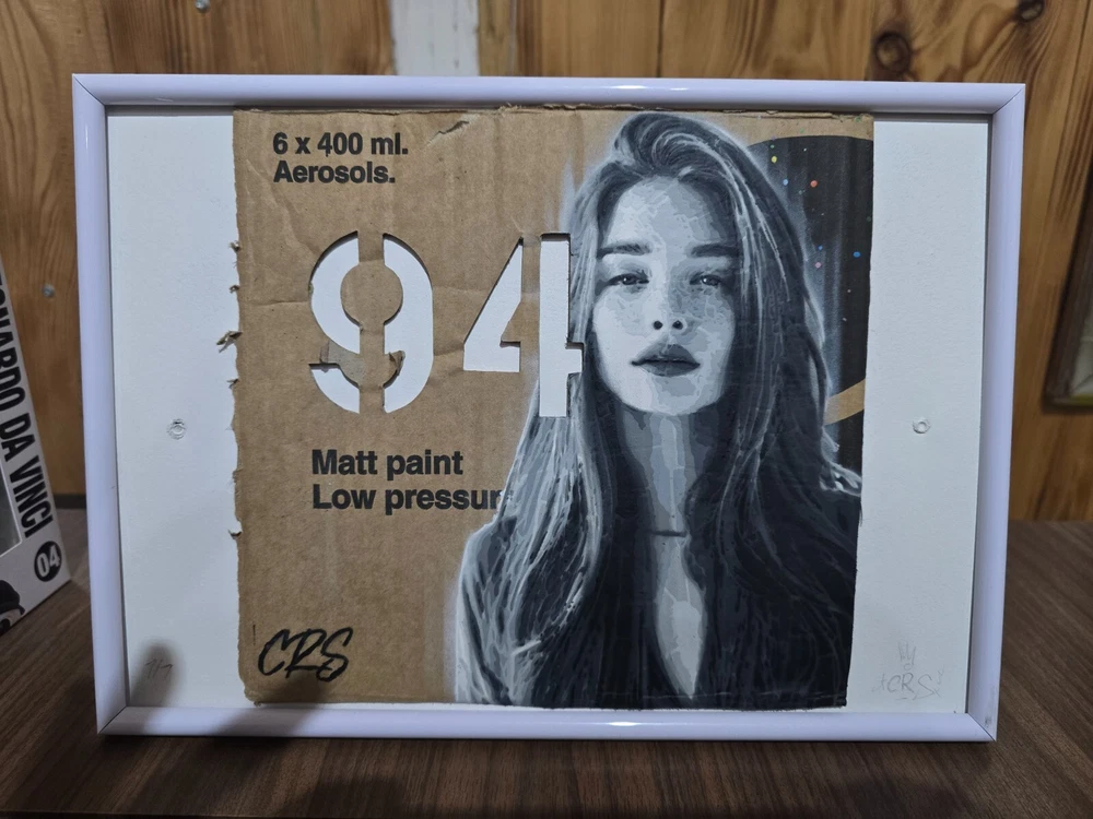 Introducing an original painting by CRS, known as the Banksy of Cyprus. This one-of-a-kind piece features a realistic portrait of a subject, painted on cardboard using spray techniques. The artist has signed the painting and provided a Certificate of Authenticity (COA) for its originality. Measuring small in size, this painting has been framed and personalized by the artist. It is a handmade piece that showcases the art of stencil art and is perfect for any art enthusiast. Produced in 2024, this painting is a unique addition to any collection and is sure to impress.