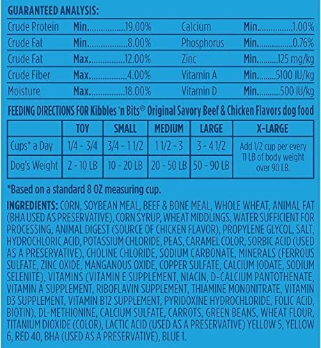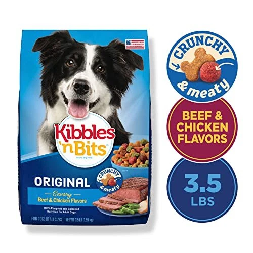 Kibbles 'n Bits Original dry dog food is full of flavors and benefits that will get your dog’s tail wagging. Our signature mix of crunchy kibble and meaty bits is made with high-quality protein and irresistible beef and chicken flavors for delicious nourishment in every bite! This adult dog food offers 100 percent complete and balanced nutrition that you can feel good about serving your dog every day. Plus, it’s produced in the USA from globally sourced ingredients. So, make your dog’s life even more tasty and fill their bowl with this satisfying meal from Kibbles 'n Bits. Contains 1 3.5-pound bags of Kibbles 'n Bits Original Dog Food Irresistible beef and chicken flavors Crunchy dog kibble and meaty bits 100% complete and balanced nutrition for adult dogs Produced in the USA from globally sourced ingredients