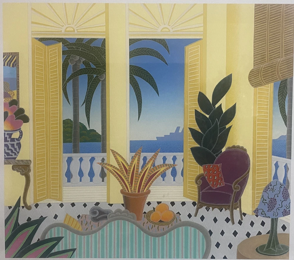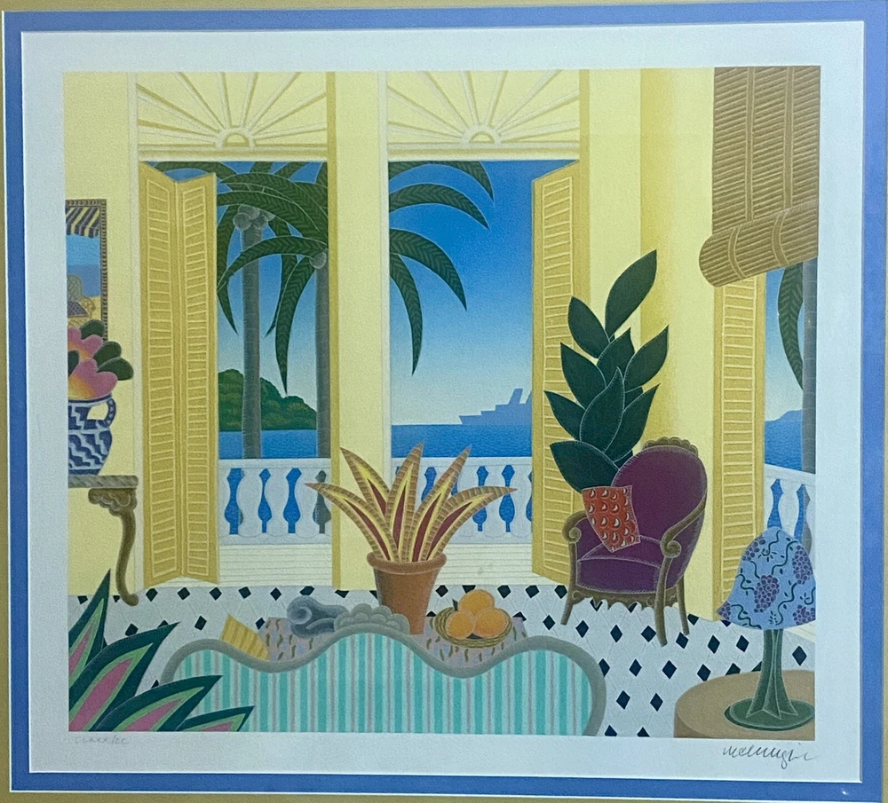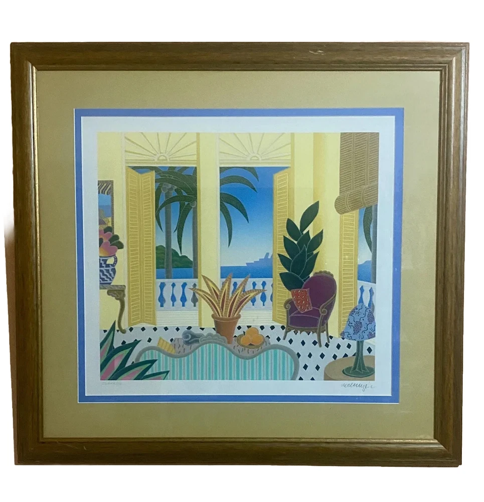 This Thomas McKnight limited edition serigraph titled "Nassau" is a beautiful piece for any art lover. The print is signed and numbered CLXXX/CC (180/200) by the artist himself. Measuring 18 inches in height and 20 inches in width, this piece showcases stunning architecture and houses in a picturesque setting. The print is made using lithography production technique on high-quality paper material. It comes matted and framed, ready to be displayed in your home or office. This piece is a single piece unit of sale listed by a dealer or reseller. It is a handmade, original print from 1988 and would make an excellent addition to any collection.