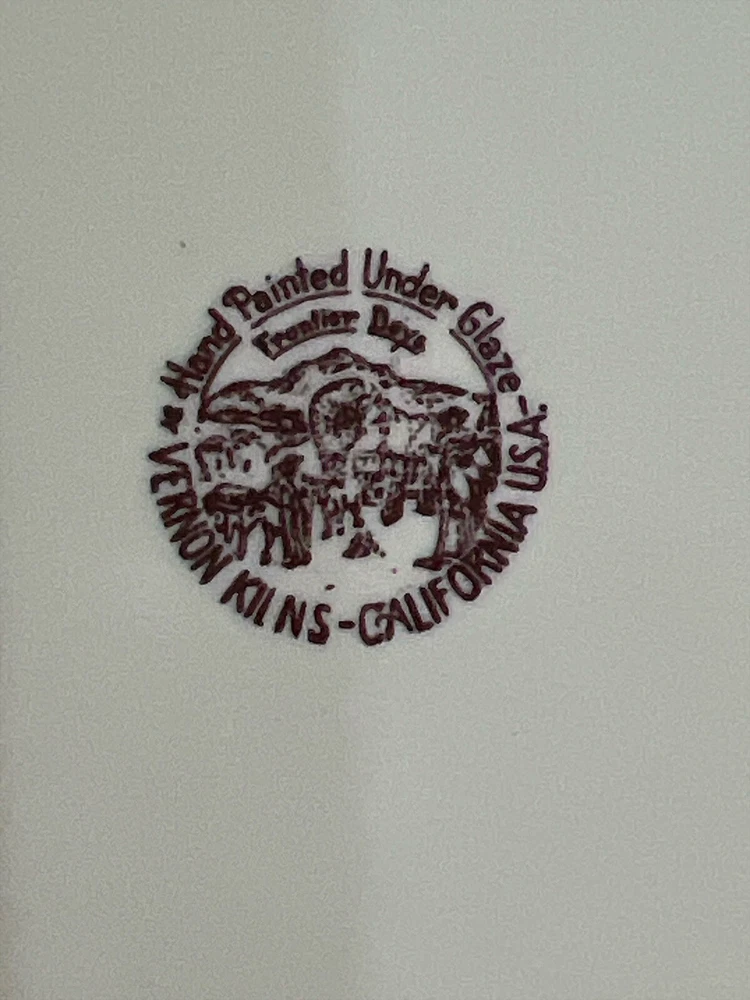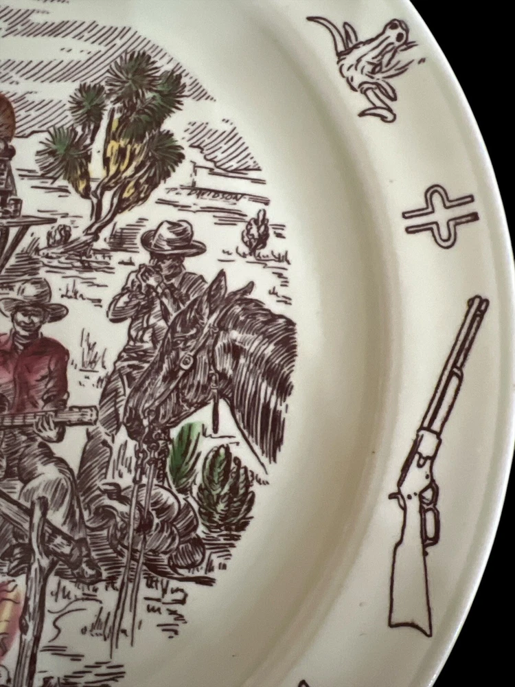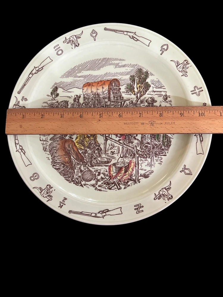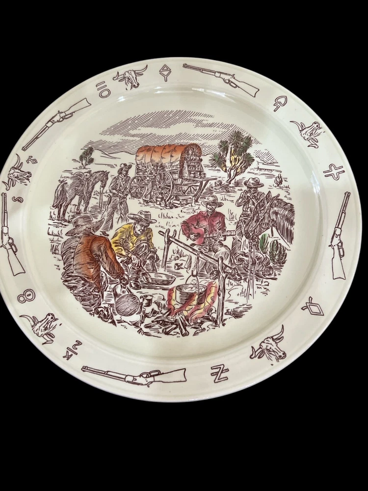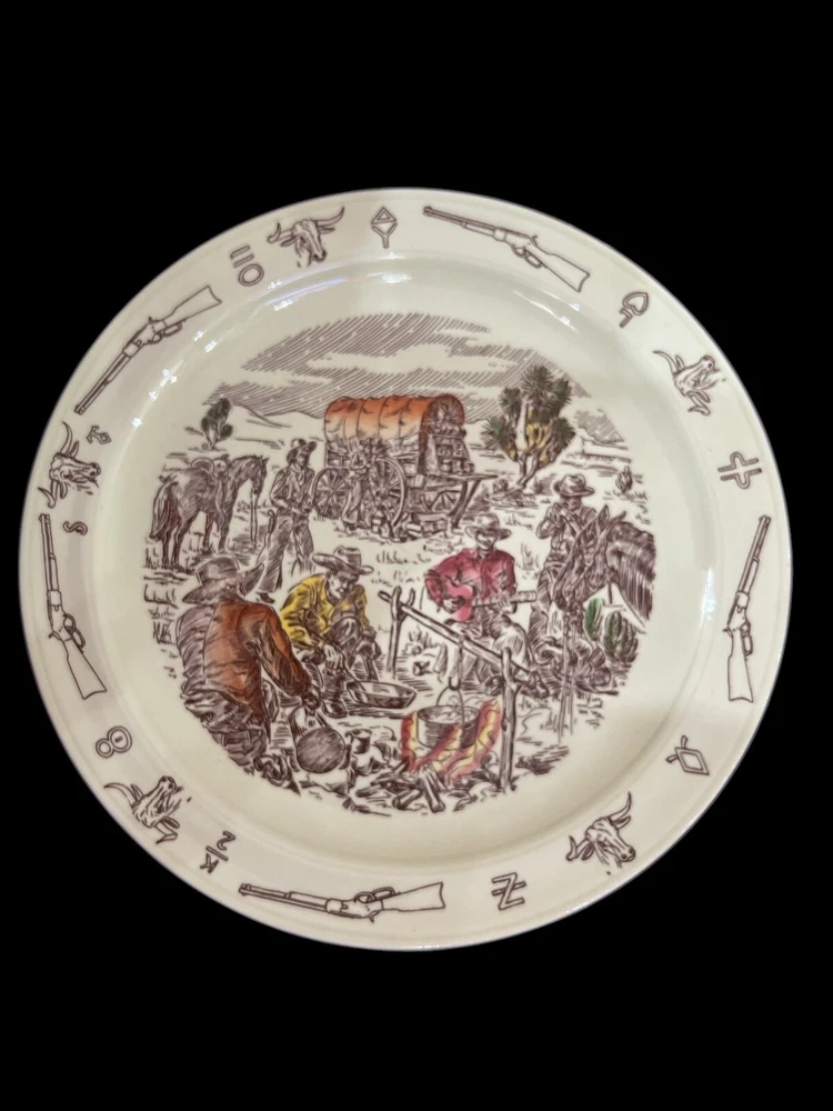 Vernon Kilns California USA, Winchester ‘73 “Frontier Days” Pattern of Covered Wagon and Cowboys by the Campfire. Hand Painted Ceramic 10.5” Diameter Dinner Plate. Excellent Condition. Smoke/Pet Free Environment. Vernon Kilns produced the Winchester '73 pattern in 1950 to coincide with the release of Universal International's picture of the same name. It was produced until 1953 when the name was changed to Frontier Days, which was produced until 1954. Artwork is by Paul Davidson.