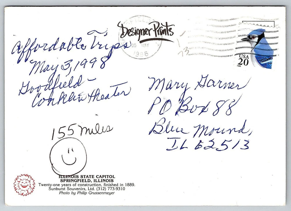 Postage Condition: Posted Signed By: Sender Material: Paper Unit of Sale: Single Unit Orientation: Vertical Seller Notes: “Good Vintage Condition.” Country/Region of Manufacture: United States Signed: Yes Region: Illinois Time Period Manufactured: 1990-1999 Type: Mail Old Genuine Original Postcard Card Image Picture Antique Vintage: Yes Number of Items in Set: 1 Continent: North America Posted: Yes Antique: Yes Stamp: Yes Theme: Architecture, Cities & Towns, Community Life, Famous Places, Historical Figures, Landscapes, Politics, Roadside America, Seasons, Social History, Tourism gtin13: DOES NOT APPLY UPC: DOES NOT APPLY Country: United States Finish: Glossy Subject: Cities & Towns Features: Stamp, Stamped, Undivided Back, Original Genuine Antique Vintage Postcard Original/Licensed Reprint: Original Size: 6" x 4" Color: Multicolor Brand/Publisher: Sunburst Souvenirs Era: Undivided Back (1901-1907) City: Springfield Featured Person: None