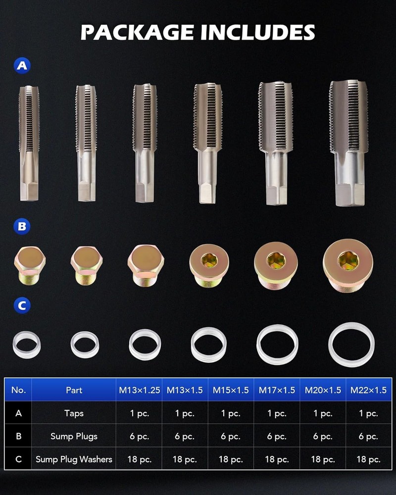Orion Motor Tech 150pc Oil Drain Plug Repair Kit in M13 M15 M17 M20 M22 Sizes, Metric Oil Drain Pan Thread Repair Kit with Crush Washers Thread Taps Drain Plugs and Carry Case, Rethreading Tools Product Details Manufacturer: Orion Motor Tech Brand: Orion Motor Tech Model: TRK-A003-00 Item Weight: 5.63 pounds Package Dimensions: 11.34 x 10.39 x 4.29 inches Item model number: TRK-A003-00 Exterior: Polished Manufacturer Part Number: TRK-A003-00 Special Features: Easy Operation, Wide Application, Durability QUICK & EASY REPAIRS: Easily restore the damaged or stripped threads on your oil pan with Orion Motor Tech's 150-piece thread repair kit! Includes taps, washers, and drain plugs in the 5 most needed metric sizes: M13, M15, M17, M20, and M22 PURPOSE BUILT: The taps and crush washers are made of quality carbon steel and aluminum for durable handling, while the hex sump plugs are plated with a zinc coating for greater strength and longevity WIDE APPLICATION: Our kit accommodates oil pan threads on a variety of passenger cars and light trucks, including popular makes like Audi, VW, BMW, Citroen, Fiat, Ford, Seat, Honda, Mazda, Mitsubishi Motors, Opel, Peugeot, Renault, Toyota, and Volvo EASY USE: Each tap features sharp threads to create clear consistent threading while allowing for easy chip removal, and each drain plug is designed with a smooth bottom to provide a sure and safe grip SUPERIOR PORTABILITY: This multipurpose rethreading kit comes with a convenient carrying case to hold and organize all the parts for easy transport and storage between jobs
