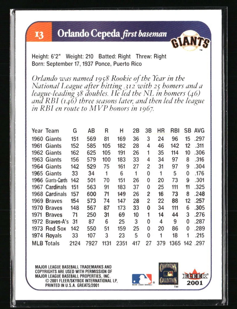 Set: Fleer Greats of the Game Autographed: No Graded: No Year Manufactured: 2001 Card Number: 13 Manufacturer: Fleer Greats of the Game League: MLB Sport: Baseball Type: Sports Trading Card Player/Athlete: Orlando Cepeda Season: 2001