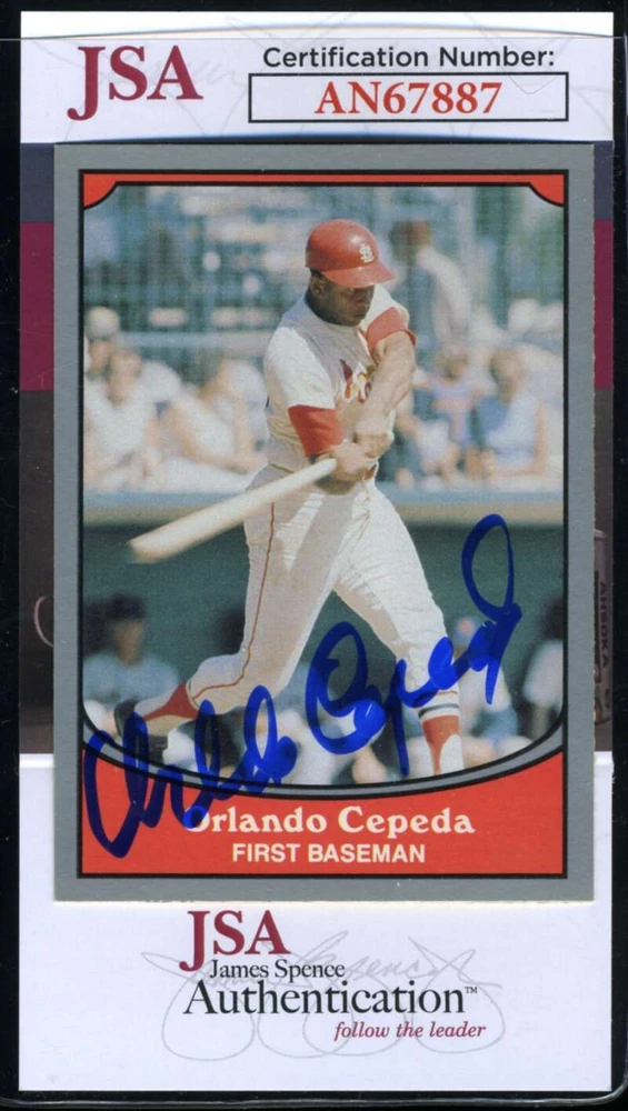 Player/Athlete: Orlando Cepeda Grade: Authentic Autograph Authentication: James Spence Authentication (JSA) Type: Sports Trading Card Country/Region of Manufacture: United States Card Number: 65 Manufacturer: MLB gtin13: Does Not Apply Sport: Baseball Original/Reprint: Original Autographed: Yes Team: mlb Graded: No UPC: Does Not Apply