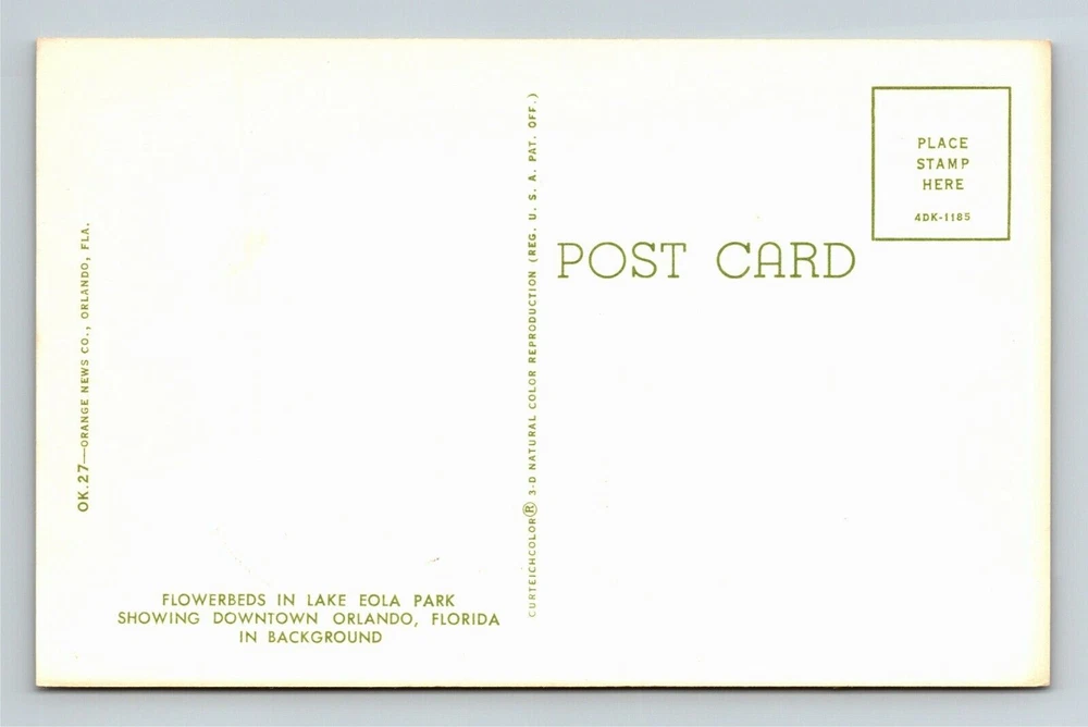 Orlando FL, Lake Eola Park, Gardens, Downtown, Florida Vintage Postcard Â