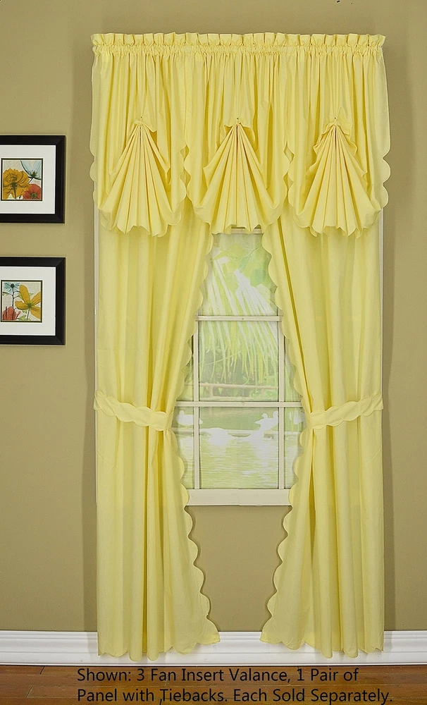 Orleans: tambour scallop edge curtain a classic look reminiscent of the Cape Cod curtain in style but with an updated design. This 50percent cotton 50percent polyester tambour scallop edge curtain will bring grace and elegance to any room. Every piece is beautifully embellished with scalloped edge bottom and/or side. Swags, valances and fan inserts are available to create your own favorite combinations of window toppers. Tiers in 30 inch and 36 inch come with pair of tiebacks. Panel pairs comes with pair of coordinated tiebacks! each piece hangs with a rod pocket and fit a rod up to 1 inch in diameter. Available in colors: white, ecru, sage, Buttercup, brick red and linen. Machine washable, easy care. Panel pair with tiebacks, valances, swag pair, Tier pair and fan insert are sold separately. 65Percent polyester; 35Percent cotton Engineered Tambour Scallop Edges Solid color, poly-cotton blend, Easy care-machine washable Engineered tambour scallop edges in L shaped panel pair, 2 tiebacks included, 4-piece-set
