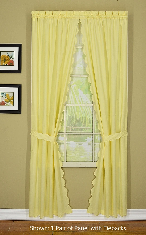Orleans: tambour scallop edge curtain a classic look reminiscent of the Cape Cod curtain in style but with an updated design. This 50percent cotton 50percent polyester tambour scallop edge curtain will bring grace and elegance to any room. Every piece is beautifully embellished with scalloped edge bottom and/or side. Swags, valances and fan inserts are available to create your own favorite combinations of window toppers. Tiers in 30 inch and 36 inch come with pair of tiebacks. Panel pairs comes with pair of coordinated tiebacks! each piece hangs with a rod pocket and fit a rod up to 1 inch in diameter. Available in colors: white, ecru, sage, Buttercup, brick red and linen. Machine washable, easy care. Panel pair with tiebacks, valances, swag pair, Tier pair and fan insert are sold separately. 65Percent polyester; 35Percent cotton Engineered Tambour Scallop Edges Solid color, poly-cotton blend, Easy care-machine washable Engineered tambour scallop edges in L shaped panel pair, 2 tiebacks included, 4-piece-set