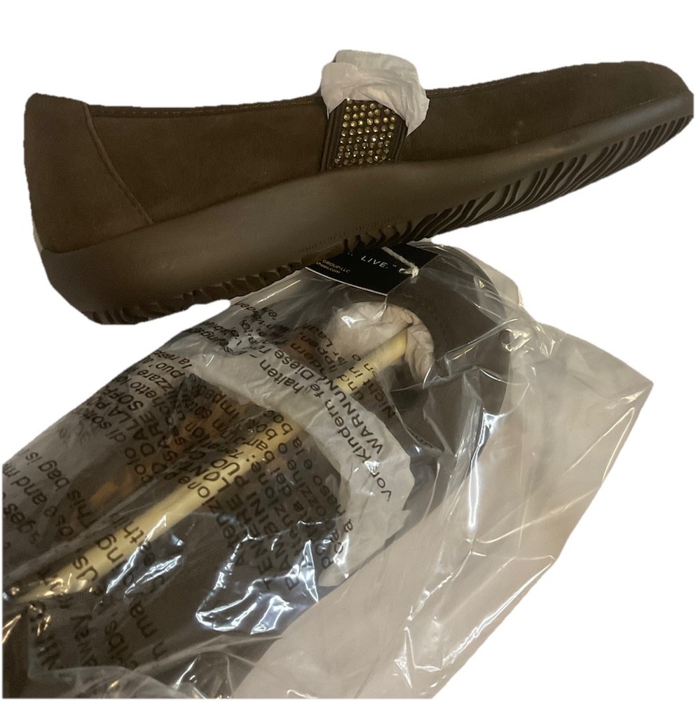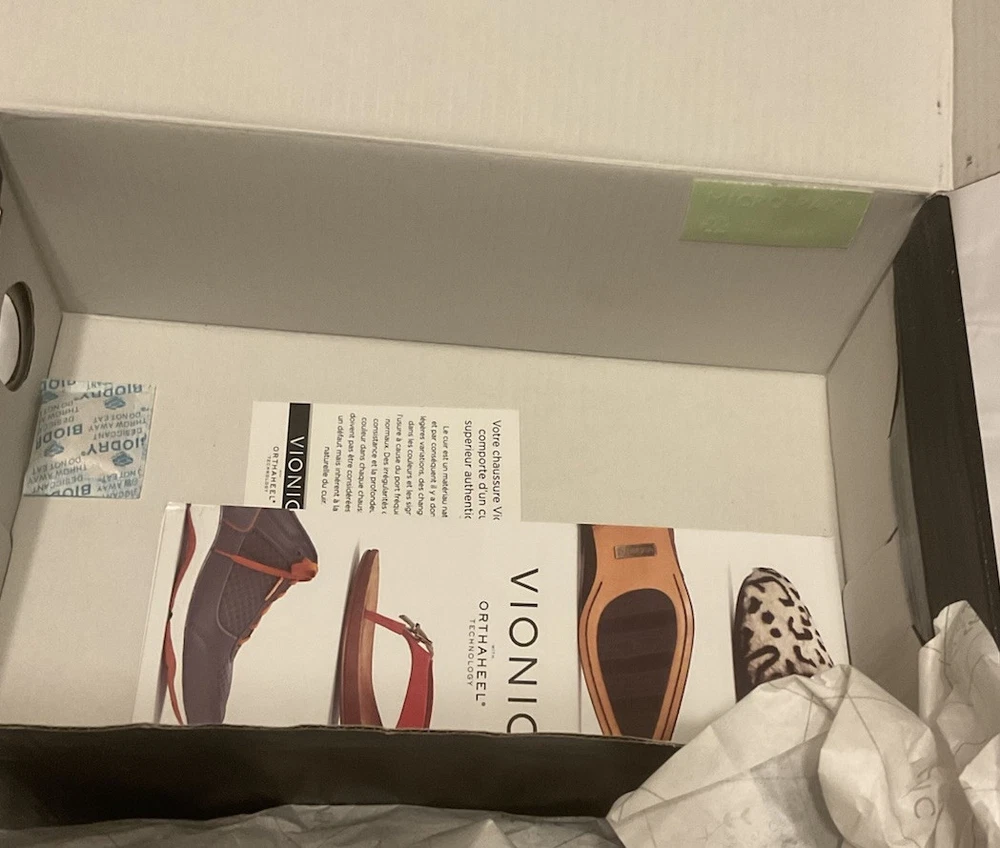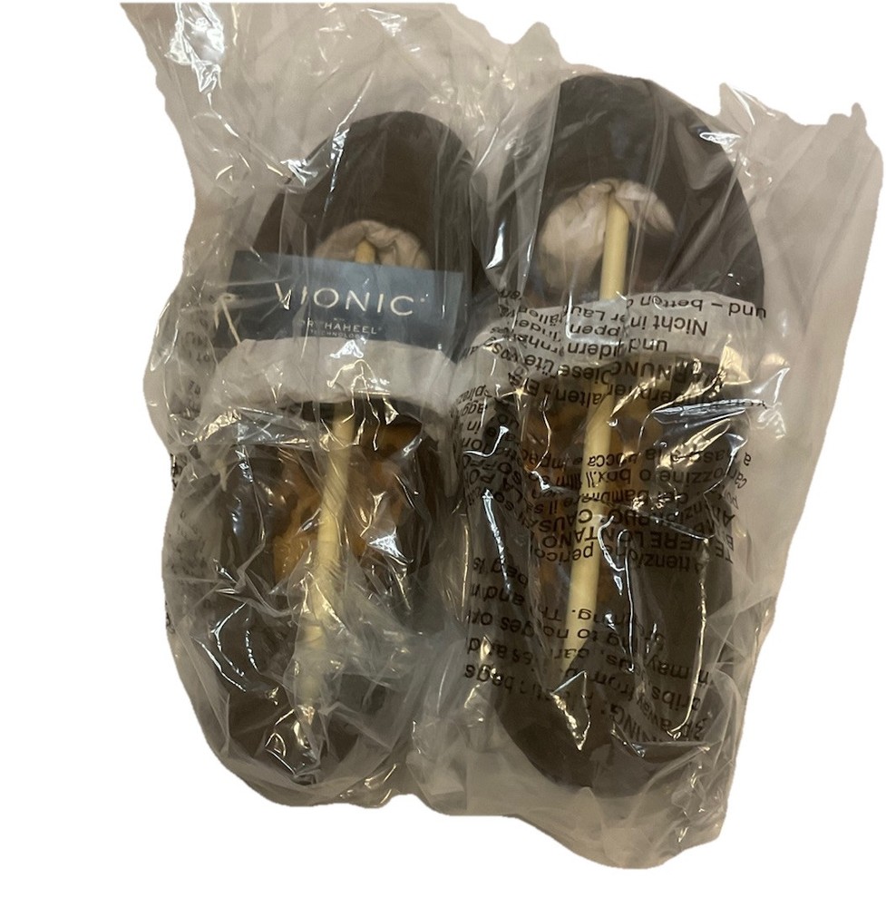 This is a pair of women's Vionic Orthaheel shoes in dark brown leather with an elastic decorative strap. They are slip-on style with a low heel height, suitable for casual occasions. The shoes feature comfort technology and are designed for standard shoe width. They are ideal for summer, fall, and spring seasons. The shoes are a size 3 in UK sizing, which corresponds to a size 5 in US sizing.