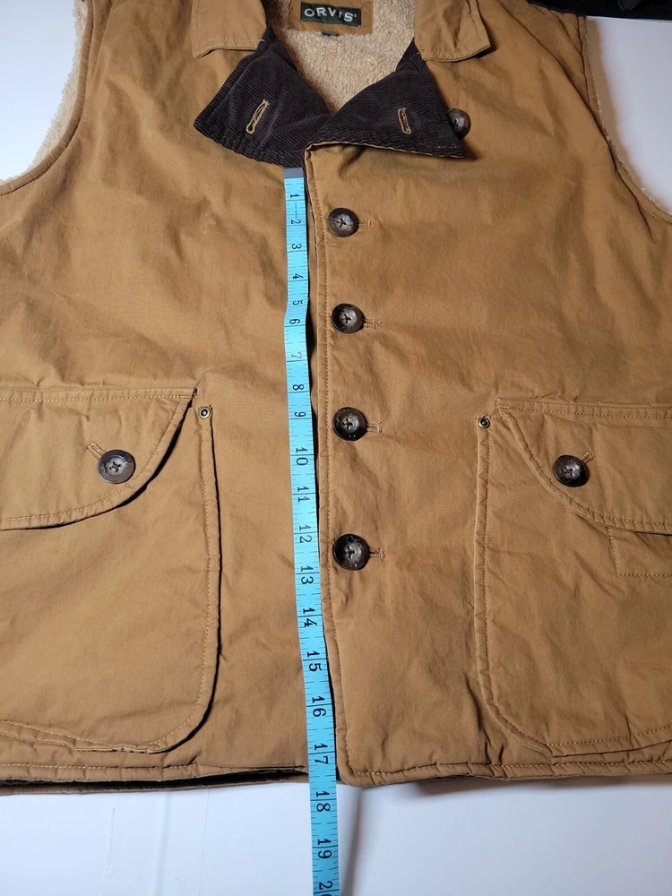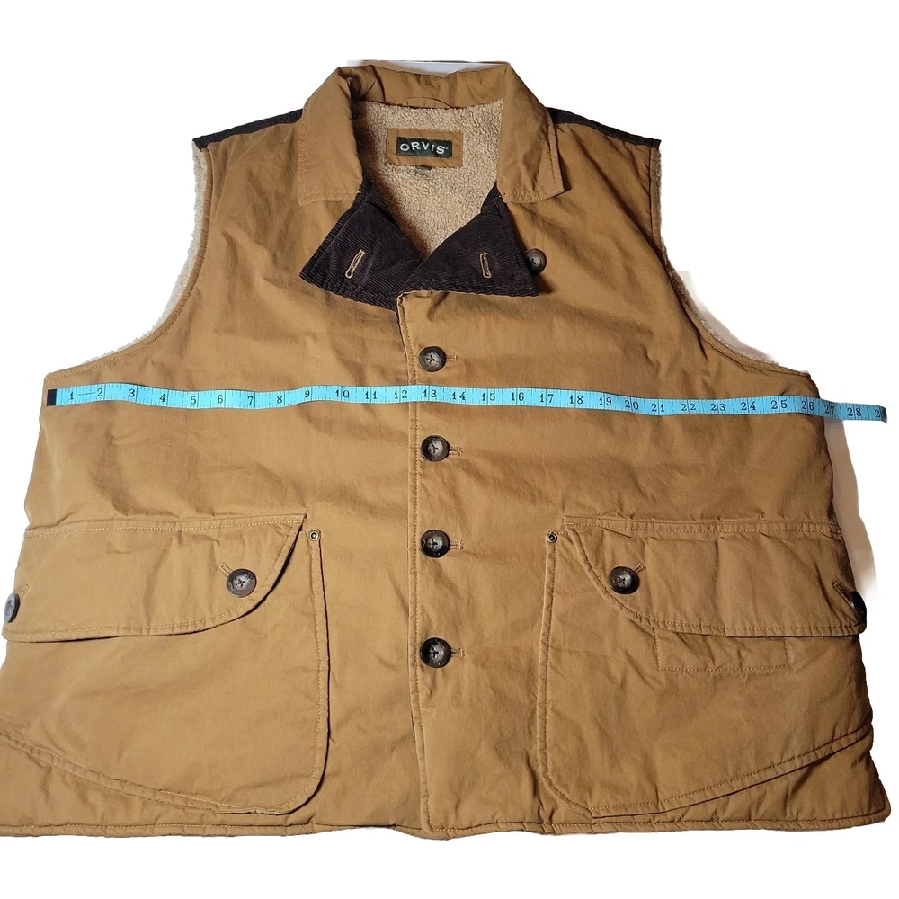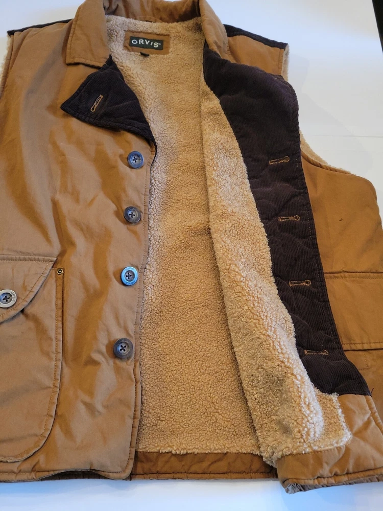 Orvis sherpa lined Brown Button Up Mens Outdoor vest Size XL With Botton Pockets Pre-owned in excellent condition See photos for measurements You will receive the exact item shown in the photos If you have any questions, please feel free to ask thanks