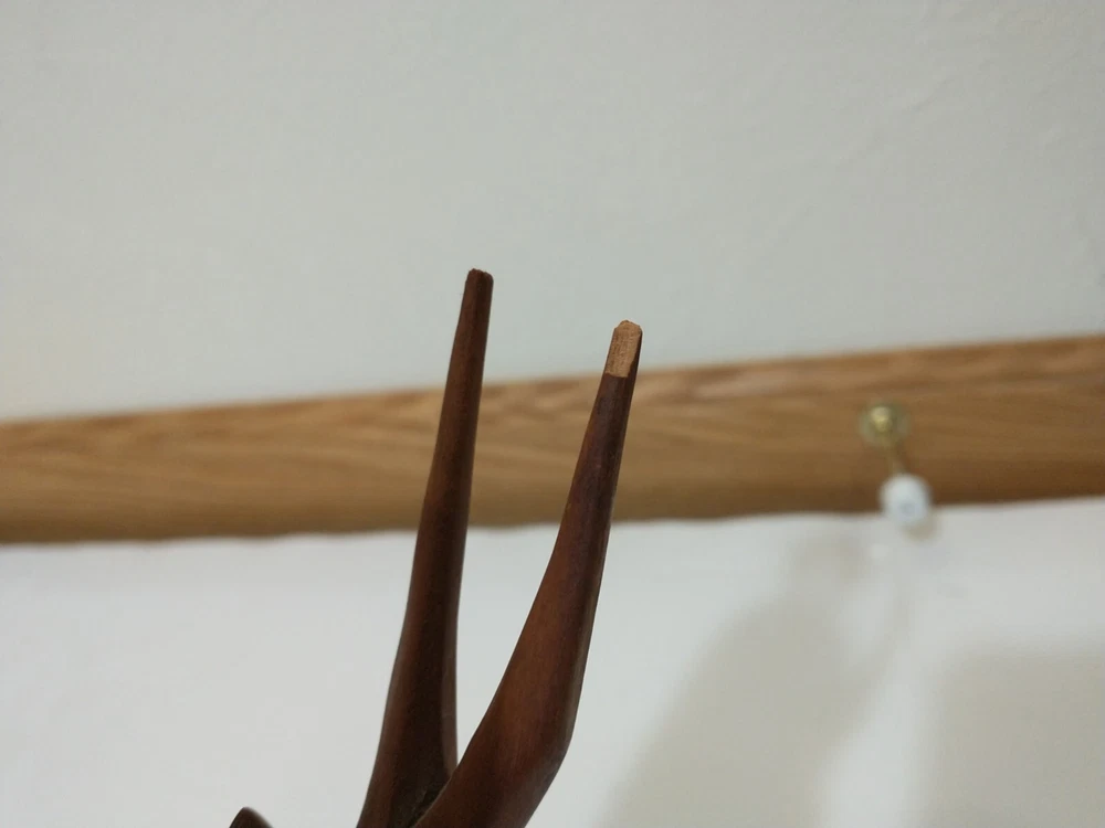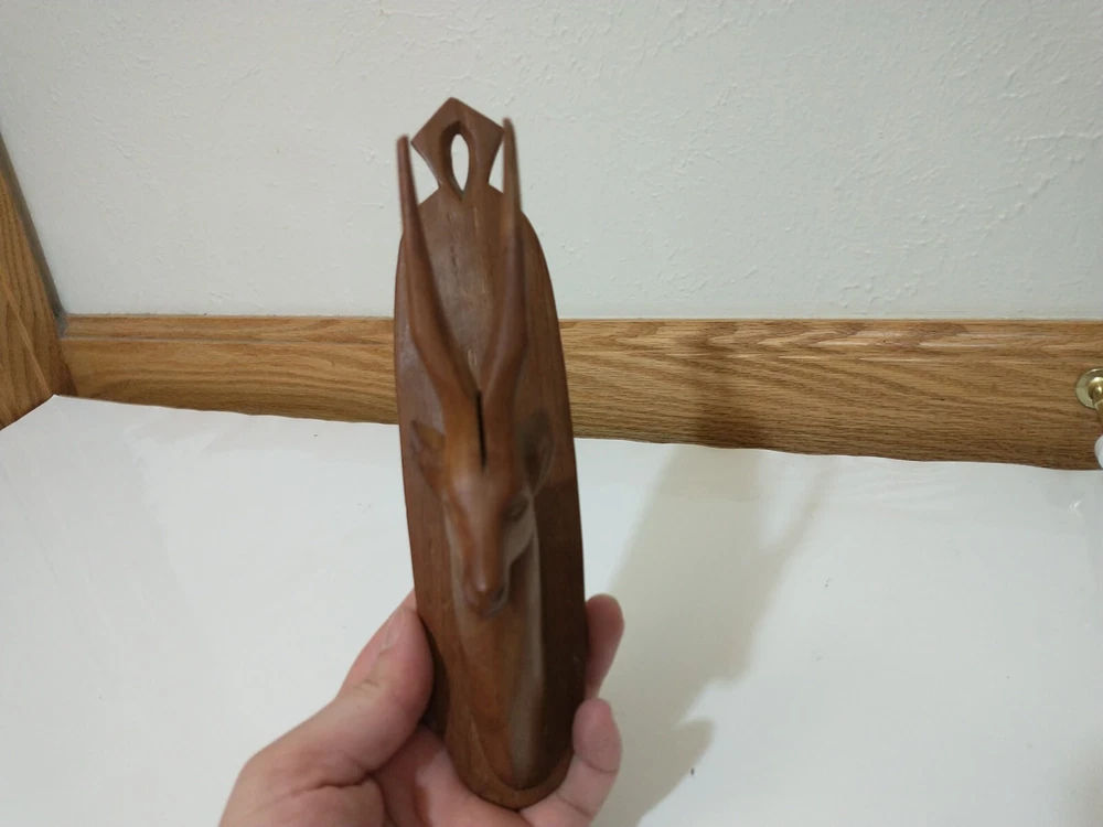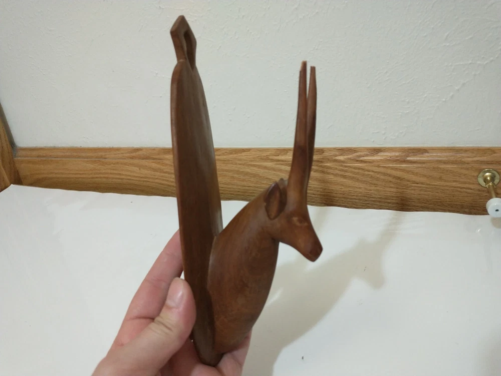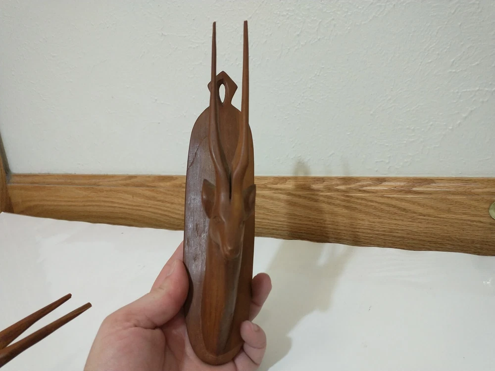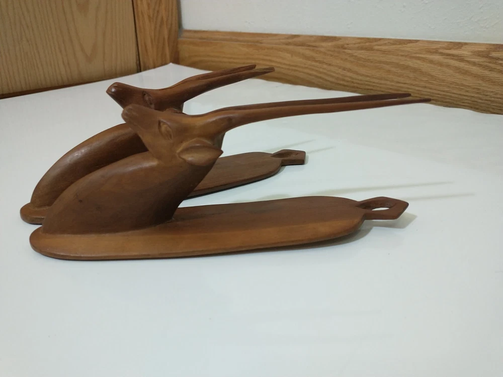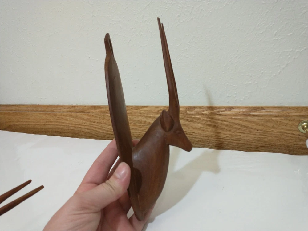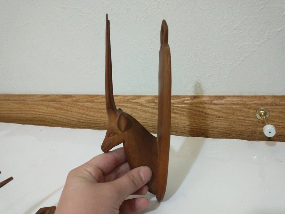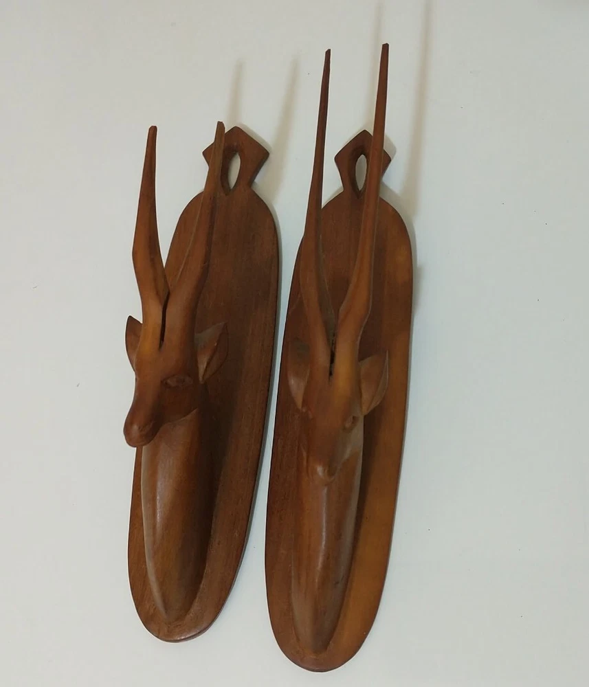 Lot of 2 wood carved hat hangers I believe they are supposed to be the Oryx Antelope The bases measure about 8.5" long and about 2" wide The tips of the antlers on one of them have broken off but the other one is in good shape Best offers welcome Will ship within two business days of receiving payment All sales are final and no returns or refunds will be issued Thanks so much for looking and have a wonderful day!