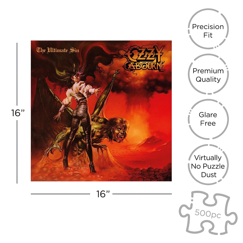 Released on 22nd February 1986, "The Ultimate Sin" is the fourth studio album by British heavy metal vocalist Ozzy Osbourne. The album was a commercial success and was Osbourne's highest-charting studio album at the time of it's release. The RIAA awarded the album Platinum status on 14 May 1986; it was awarded Double Platinum status in October 1994. The album has sold over 2,000,000 copies worldwide. In the UK, it was the final of four Osbourne albums to attain Silver certification by the BPI, achieving this in April 1986. The album's iconic cover art is now available as a 500 piece jigsaw puzzle printed on high quality board.500 pieces Weight: 490gJigsaw size: 41cm x 41cm Box size: 30.9cm x 30.9cm x 2.8cm Great for College Dorms or Apartments Officially Licensed Brand New Never Been Used Merchandise