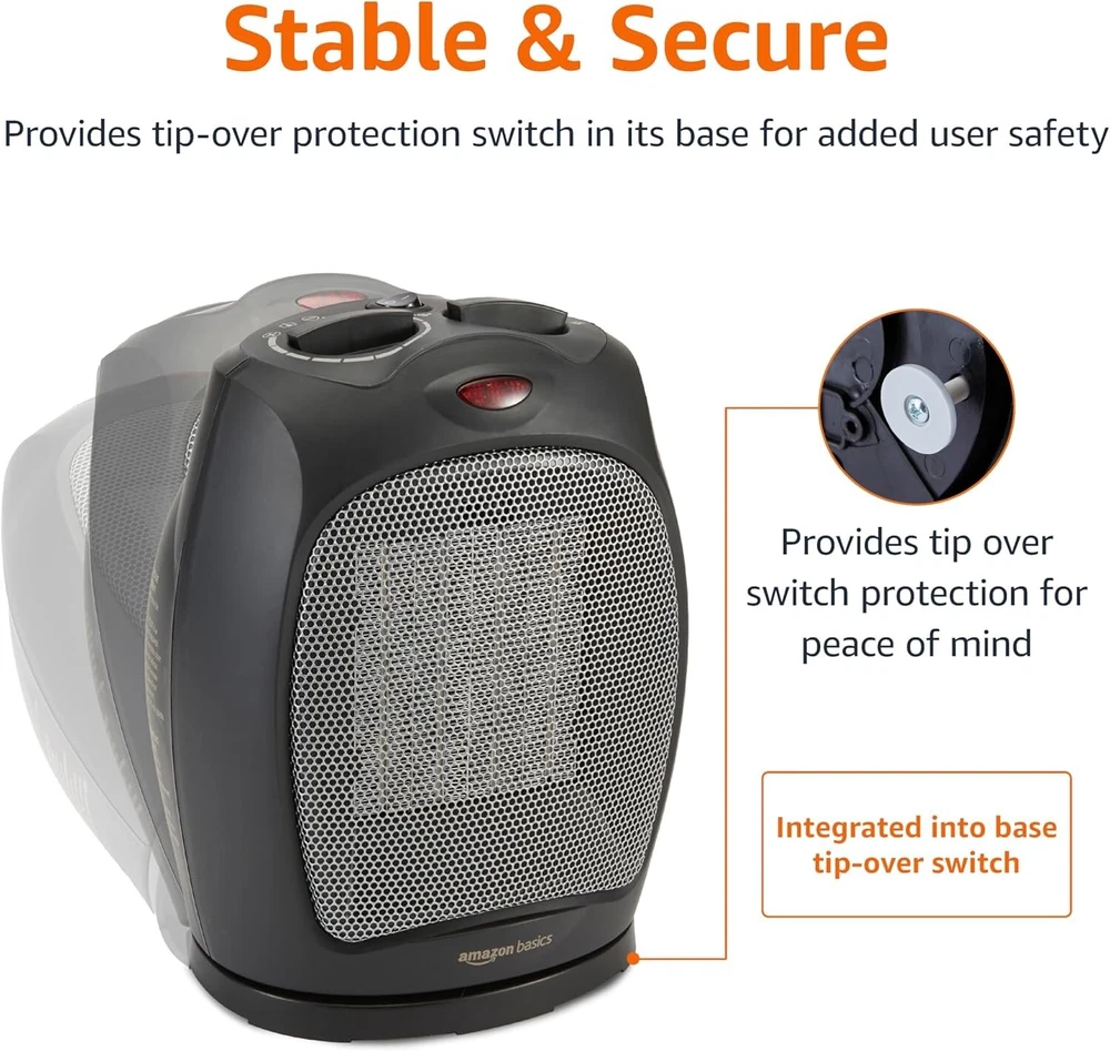 Oscillating Ceramic Space Heater, Portable Heater for Indoor Use, for Office and Home, With Overheat and Tip-Over Protection, Thermostat, 1500W, Black, 7.52"D x 6.34"W x 9.45"H Description: EVEN HEAT DISTRIBUTION: The heater's 45-degree oscillation function ensures even heat distribution across the room, warming a wider area for maximum comfort. CUSTOMIZABLE HEATING OPTIONS: Choose from three settings to suit your needs - High (1500W), Low (900W), or Fan Only for air circulation without heat. COMPACT & PORTABLE: Weighing just 3 lbs and sized at 7.5“L x 6.3”W x 9.5“H, this space heater is easy to move and perfect for your Home, Office. CERTIFIED SAFETY: TÜV-Certified for peace of mind, with built-in Tip-Over Protection, Overheat Protection, and a Power Indicator Light for safe operation. RAPID HEATING TECHNOLOGY: Ceramic heating provides fast and efficient heat in minutes, keeping you warm quickly on cold days. NOT FOR HUMID ENVIRONMENTS: Please avoid using this heater in Bathrooms, Laundry Rooms, or other high-moisture areas.