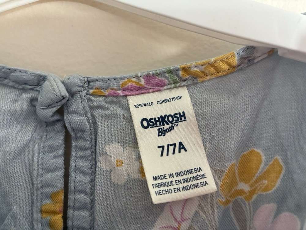Fabric Type: Viscose Sleeve Length: Sleeveless Season: Fall, Spring, Summer Brand: OshKosh B’gosh Style: Fit & Flare Garment Care: Machine Washable Size: 7 Neckline: Round Neck Accents: Bow Dress Length: Knee Length Color: Blue Department: Girls Country of Origin: Indonesia Closure: Pullover Pattern: Floral Seller Notes: “In very good condition. Free of rips or stains.” Features: Lightweight, Stretch Occasion: Casual Material: 100% Viscose Theme: Colorful, Flower
