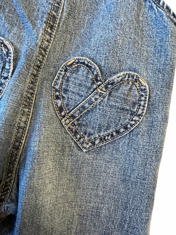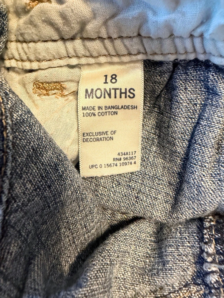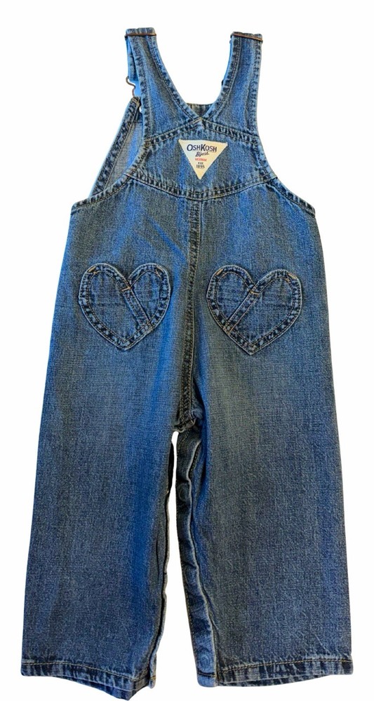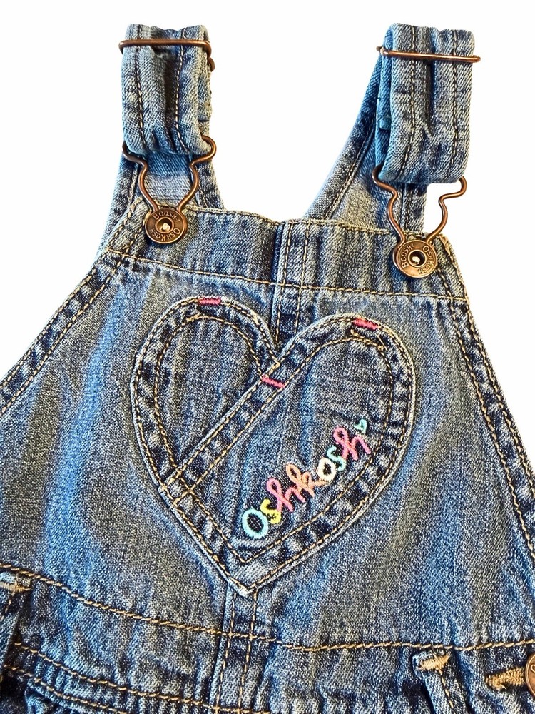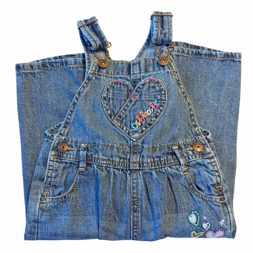 Adorable OshKosh B'gosh denim overalls for girls, size 18 months. Classic bib overall style with cute heart pocket details and colorful heart embroidery on the front. Details: • Brand: OshKosh B'gosh • Size: 18 Months • Material: 100% Cotton • Color: Blue denim • Adjustable shoulder straps • Functional pockets • Total length: 26” • Waist (across): 10” Condition: Pre-owned, good condition with normal wear. Please review photos for details.