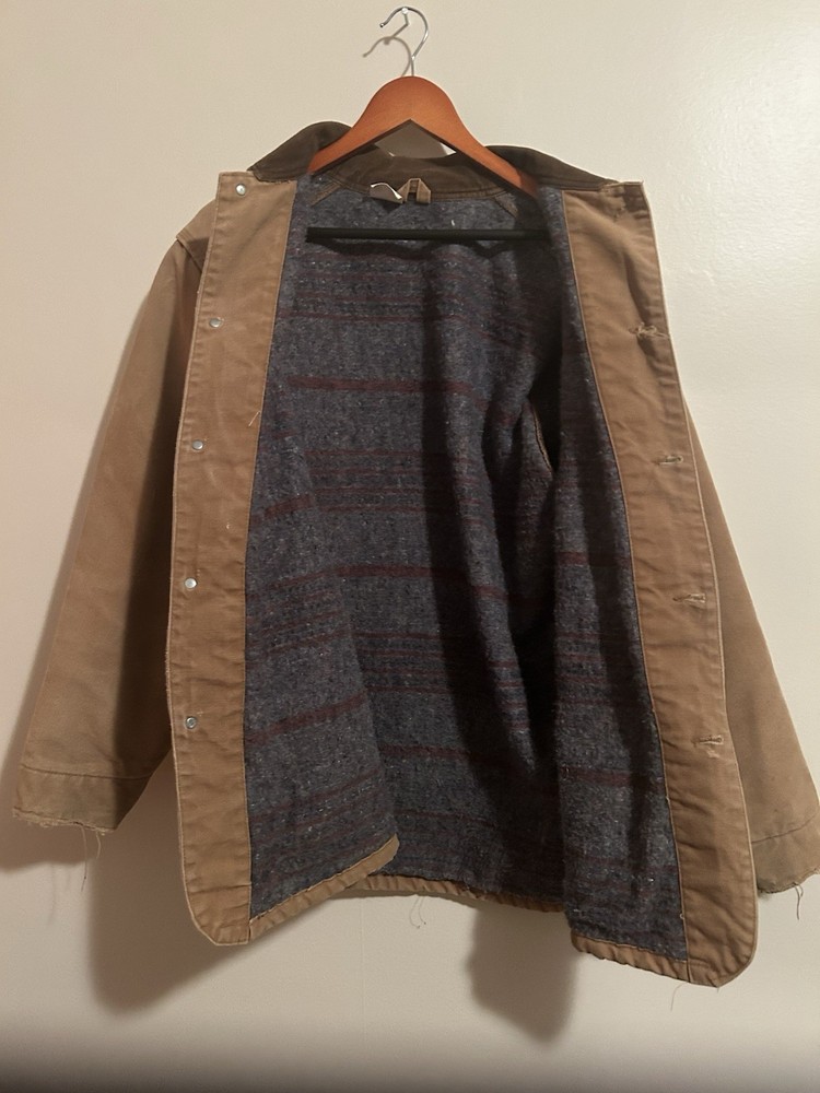 The Oshkosh Men's Brown Canvas Blanket Lined Barn Distressed Jacket in size 42 regular is a stylish and practical outerwear option for men. Made with durable canvas material and featuring a cozy blanket lining, this jacket is perfect for keeping warm during colder weather. The distressed brown color adds a trendy touch to the classic jacket style, making it a versatile piece for any man's wardrobe.