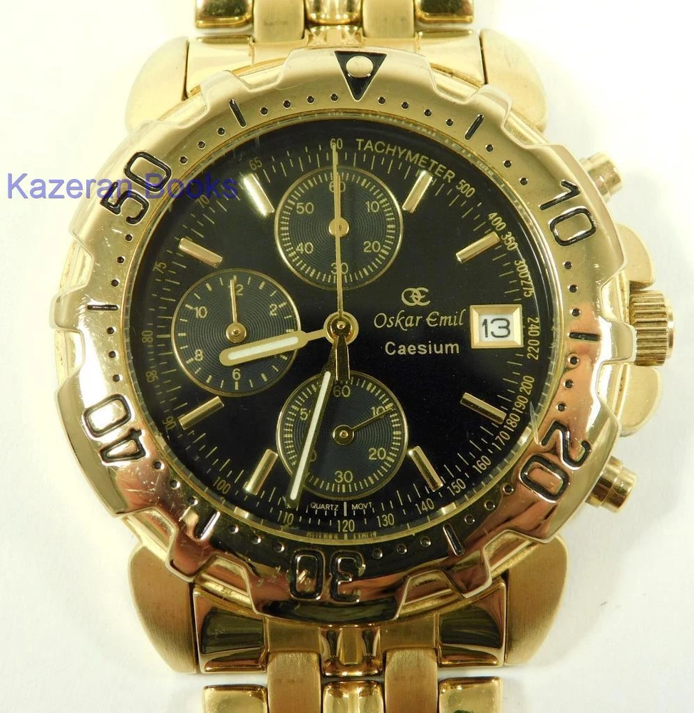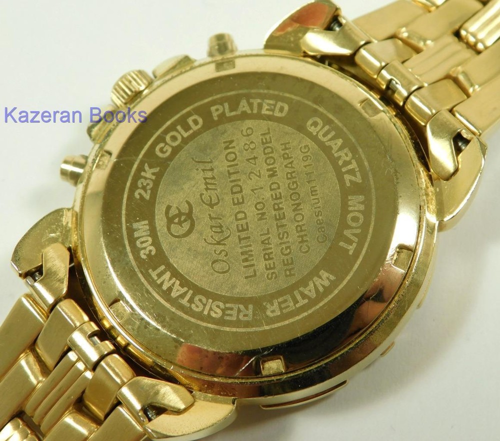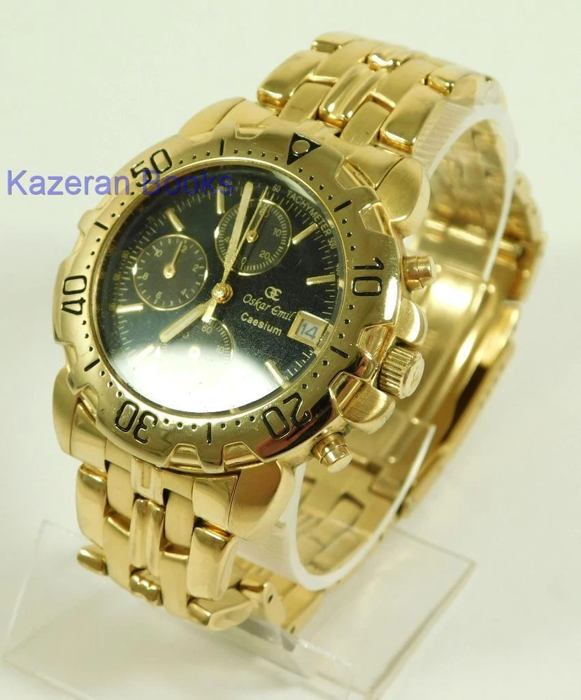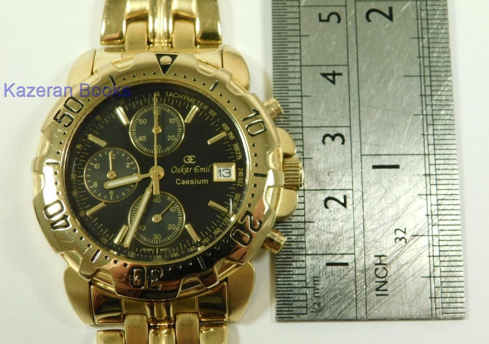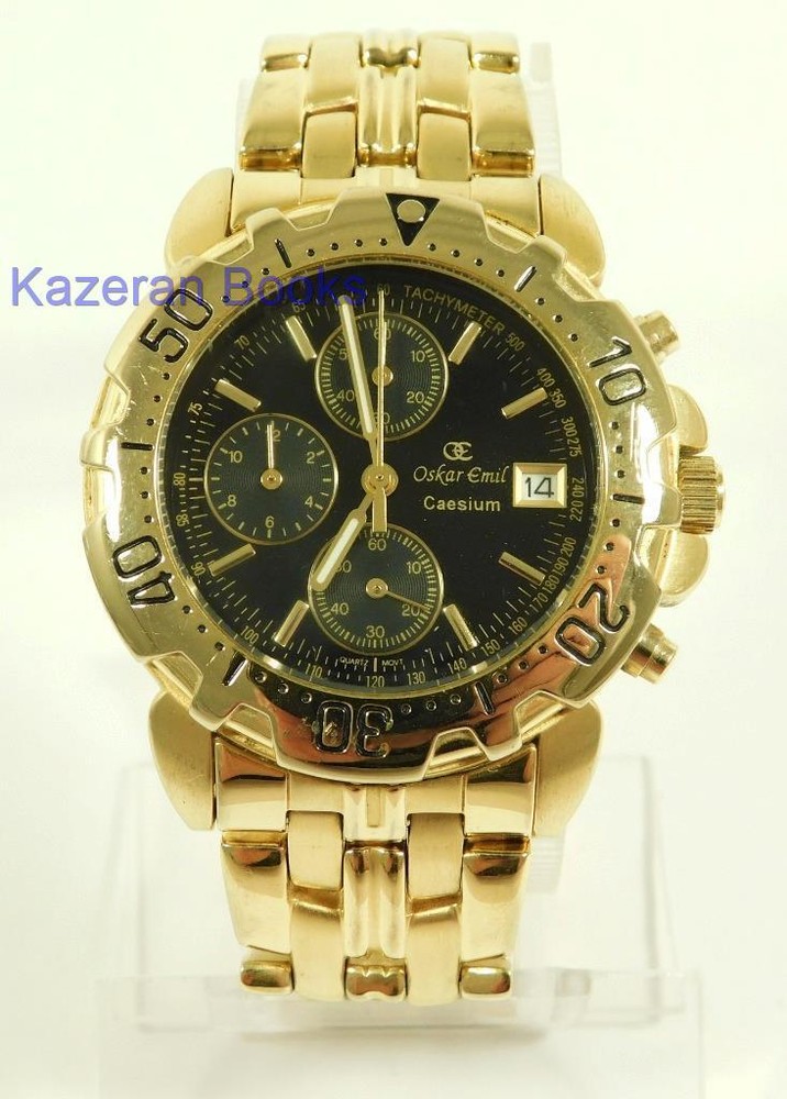 A Gentleman's "Oskar Emil - Caesium" 23ct Gold Plated, Limited Edition Black Dial Quartz Chronograph, Date Wristwatch The Watch is in full working order and has just been fitted with a new battery. The watch case measures approx 37mm across not including the crown, buttons or lugs. 20mm lug width. The strap will fit maximum 7.8" wrist. Chronograph function works as it should as does the date. The item is a limited edition, number; 12486. The quartz movement is a Miyota 0S10. Good general condition, some signs of wear. Please take a look at the photos as they form part of the description. Working Oskar Emil Caesium Quartz 23ct GP Chronograph Wristwatch Ltd Edition Working Oskar Emil Caesium Quartz 23ct GP Chronograph Wristwatch Ltd Edition Click images to enlarge Description A Gentleman's " Oskar Emil - Caesium " 23ct Gold Plated, Limited Edition Black Dial Quartz Chronograph, Date Wristwatch The Watch is in full working order and has just been fitted with a new battery. The watch case measures approx 37mm across not including the crown, buttons or lugs. 20mm lug width. The strap will fit maximum 7.8" wrist. Chronograph function works as it should as does the date. The item is a limited edition, number; 12486. The quartz movement is a Miyota 0S10. Good general condition, some signs of wear. Please take a look at the photos as they form part of the description. THIS IS A UK SALE IN GBP STERLING. Whilst I try to list all the negative and positive aspects of an item in my listings it remains possible that some small aspect may be missed.You would be well advised to remember that unless I list something as mint it will be a used and/or antique item which may have the marks of day to day existence upon it, for example: the odd mark here and there, slight fading etc. Please Note; with all the watches We sell, we make no claims regarding continual accuracy of time keeping. Antique & Vintage watches may need servicing, even if they are in good running condition. Unless otherwise stated they may need to be cleaned, oiled, adjusted and or timed. We do not guarantee any watches to be waterproof.. We Are Always Happy To Combine Multiple Purchases. 17462 Pictures sell! Auctiva offers Free Image Hosting and Editing. 300+ Listing Templates! Auctiva gets you noticed! The complete eBay Selling Solution. Track Page Views With Auctiva's Counter