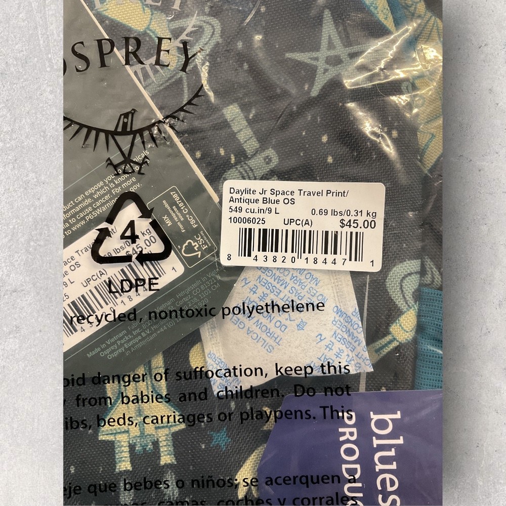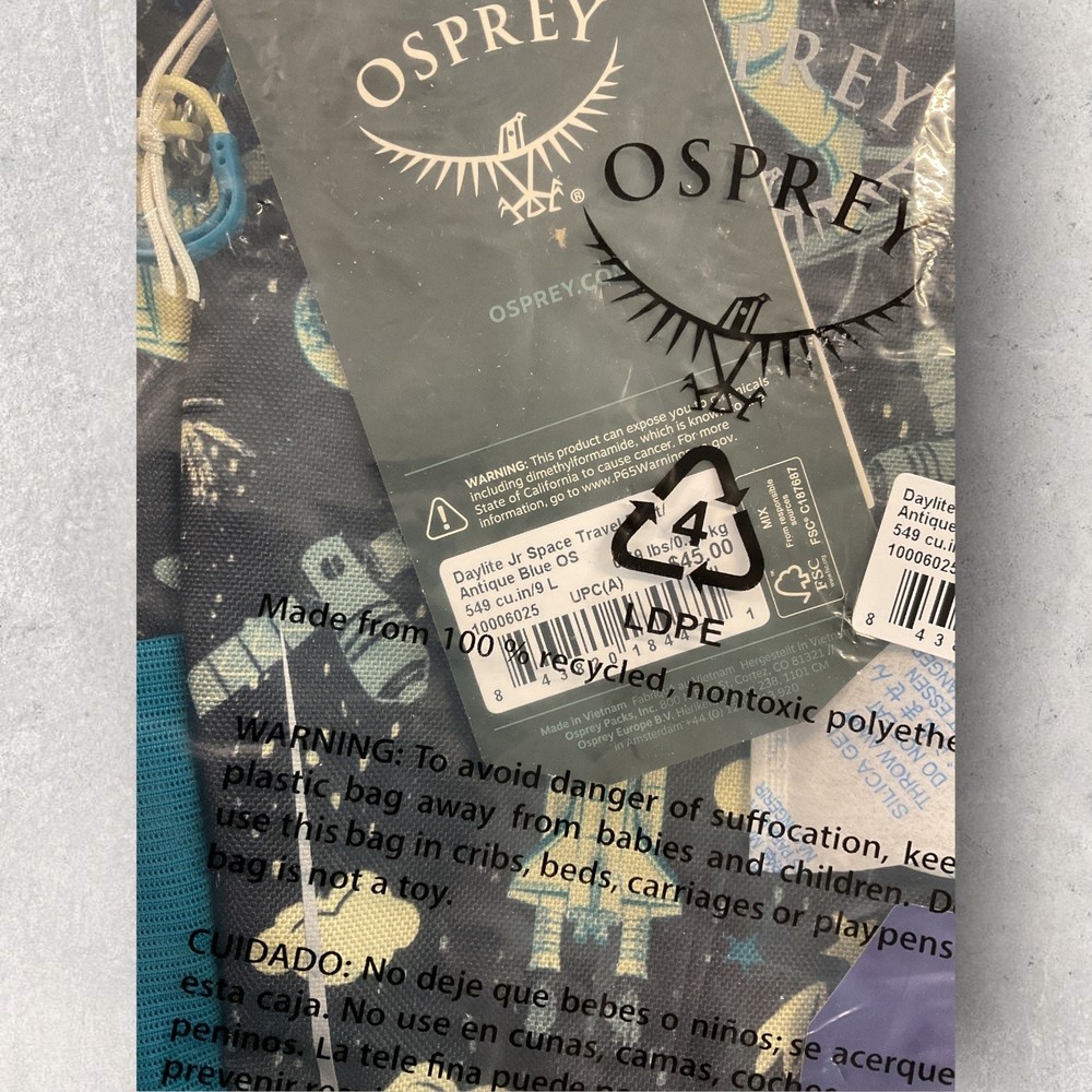 • Brand: Osprey • Model: Daylite Jr • Color/Pattern: Space travel print – black background with rockets, satellites, planets; blue accent pockets • Size: Youth / Junior size – ideal for school, day trips, or travel • Material: Durable, lightweight polyester (bluesign® approved) • Compartments: Main zippered compartment, front pocket, side mesh pockets • Straps: Adjustable padded shoulder straps for comfort • Capacity: Approx. 10 liters • Condition: Brand new with tags, still in sealed original packaging • Perfect for kids’ school use, sports activities, hiking, or travel adventures • Osprey Jr kids backpack • Space travel rocket print • Lightweight school bag • Daypack for boys or girls • Bluesign approved eco-friendly bag • Durable travel backpack • Small hiking daypack • New with tags backpack Original price: $45