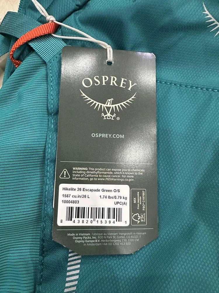 Model: Hikelite 26 Department: NA Frame Material: NA Item Depth: NA Trim Material: NA Manufacturer Warranty: NA Country: Japan Position: NA Team: NA Event Type: NA Strap Length: NA Pocket Type: NA Sport/Activity: NA Item Length: NA California Prop 65 Warning: NA Item Width: NA Compatible With: NA Product Line: NA Features: NA Country/Region of Manufacture: NA Personalized: NA Care Instructions: NA Item Weight: NA gtin13: NA Insect Repellent Treated: No Material: NA Item Height: NA Capacity: 26 liters Event: NA Number of Dividers: NA Closure: NA Handle/Strap Material: NA Number of Pockets: NA Vintage: NA Type: NA Season: NA UPC: NA Color: NA Brand: Osprey Size: NA Accents: NA MPN: NA