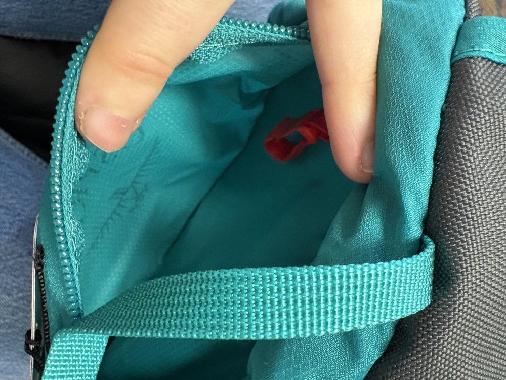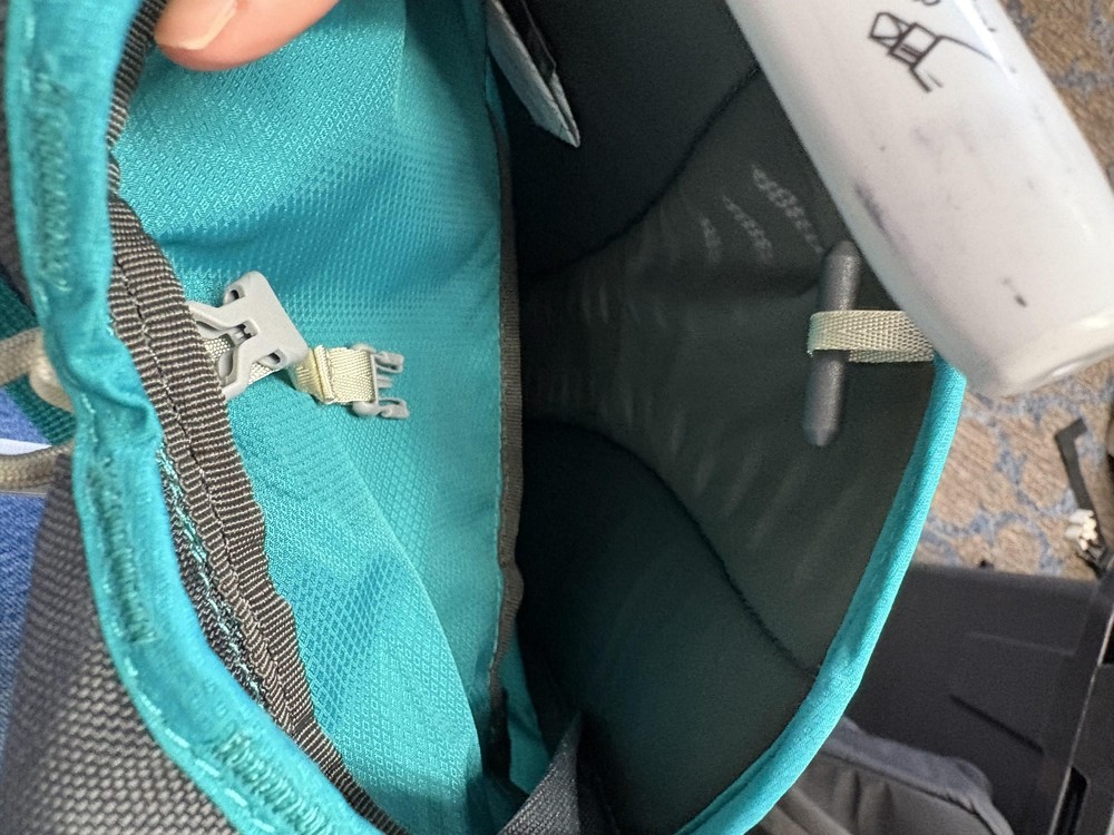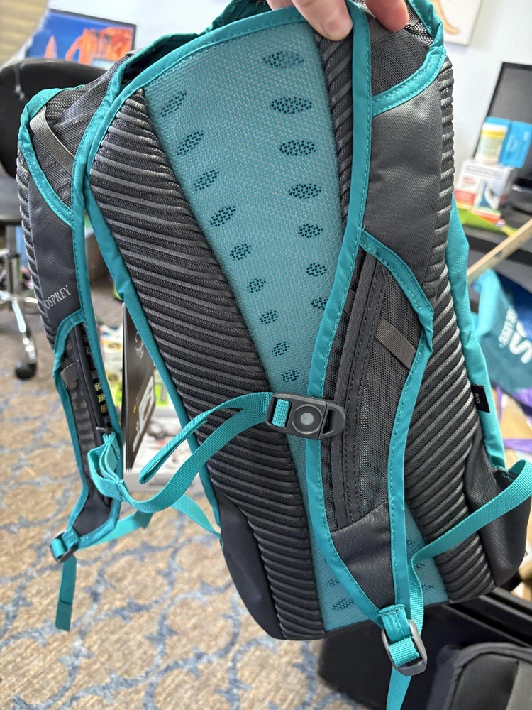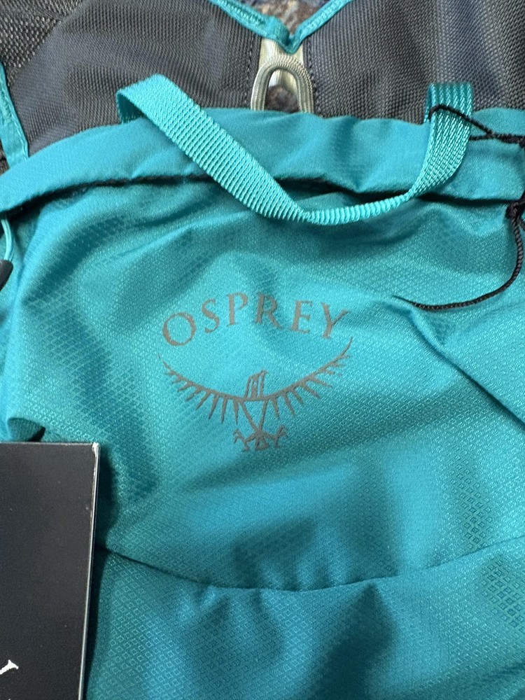 Brand: Osprey Item: Women's-specific hydration backpack/daypack with original hangtags attached. Color: Teal body with gray mesh and trim accents. Design: Compact lightweight pack with main zip compartment, interior hydration sleeve, and hose routing ports with attachment clips. Storage: Front zip pocket with internal key clip, streamlined profile suited for running, cycling, or fast hiking. Comfort features: Padded, ventilated mesh back panel and shoulder straps with adjustable sternum and side compression straps. Intended use: Ideal for hiking, trail running, biking, and other active outdoor use where a hydration reservoir is carried (reservoir not included).