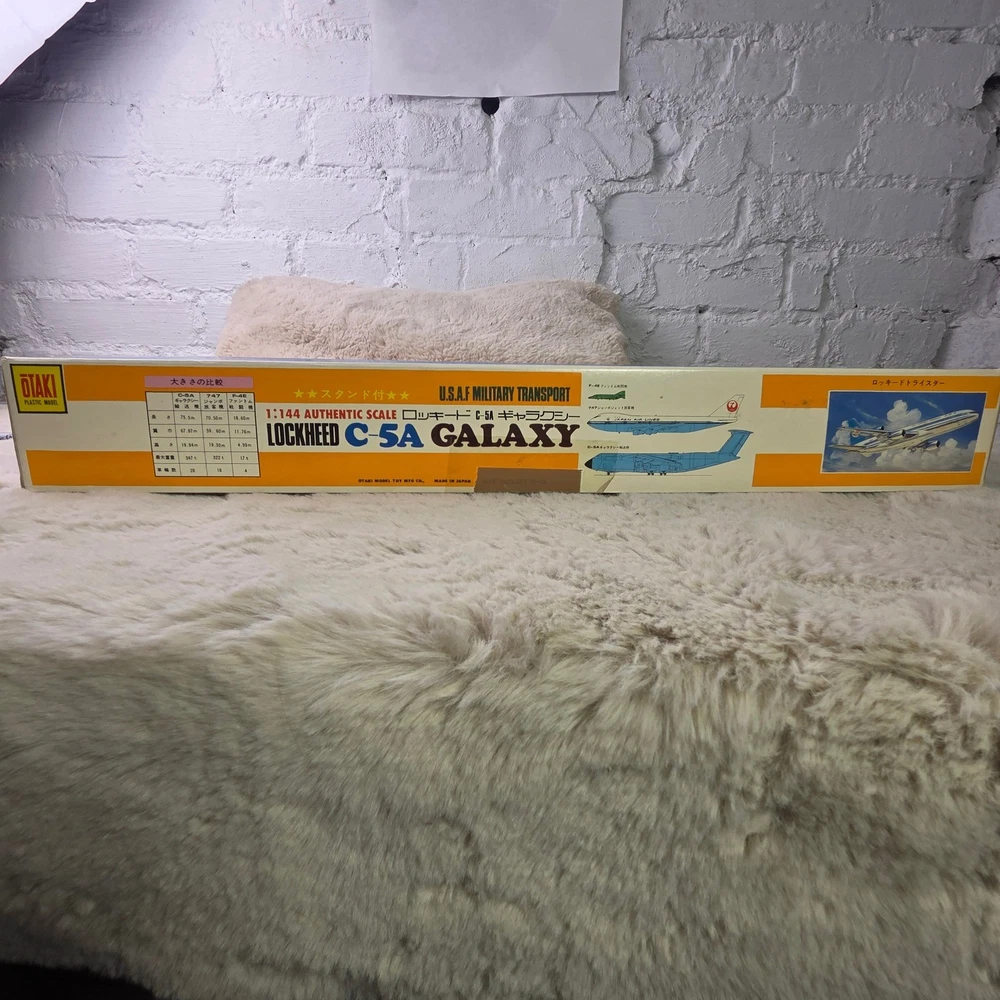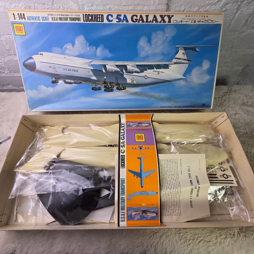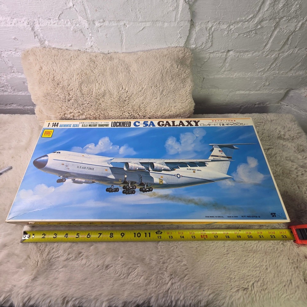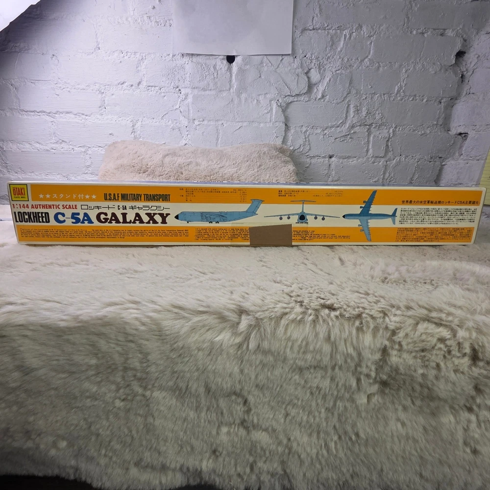 Otaki Lockheed C-5A Galaxy 1:144 scale plastic model kit features the iconic U.S.A.F. Military Transport aircraft. This authentic scale kit, manufactured in Japan, includes a display stand, assembly instructions, and a full set of Military Airlift Command decals. The internal components remain sealed in their original plastic packaging, ensuring all parts are preserved. A detailed instruction sheet provides historical facts and technical specifications for the C-5 Galaxy, making this a comprehensive project for aviation enthusiasts and model builders. Measurements: • Box Length: 23.5" • Box Width: 13" • Model Length (per box): 524mm • Model Wingspan (per box): 471mm