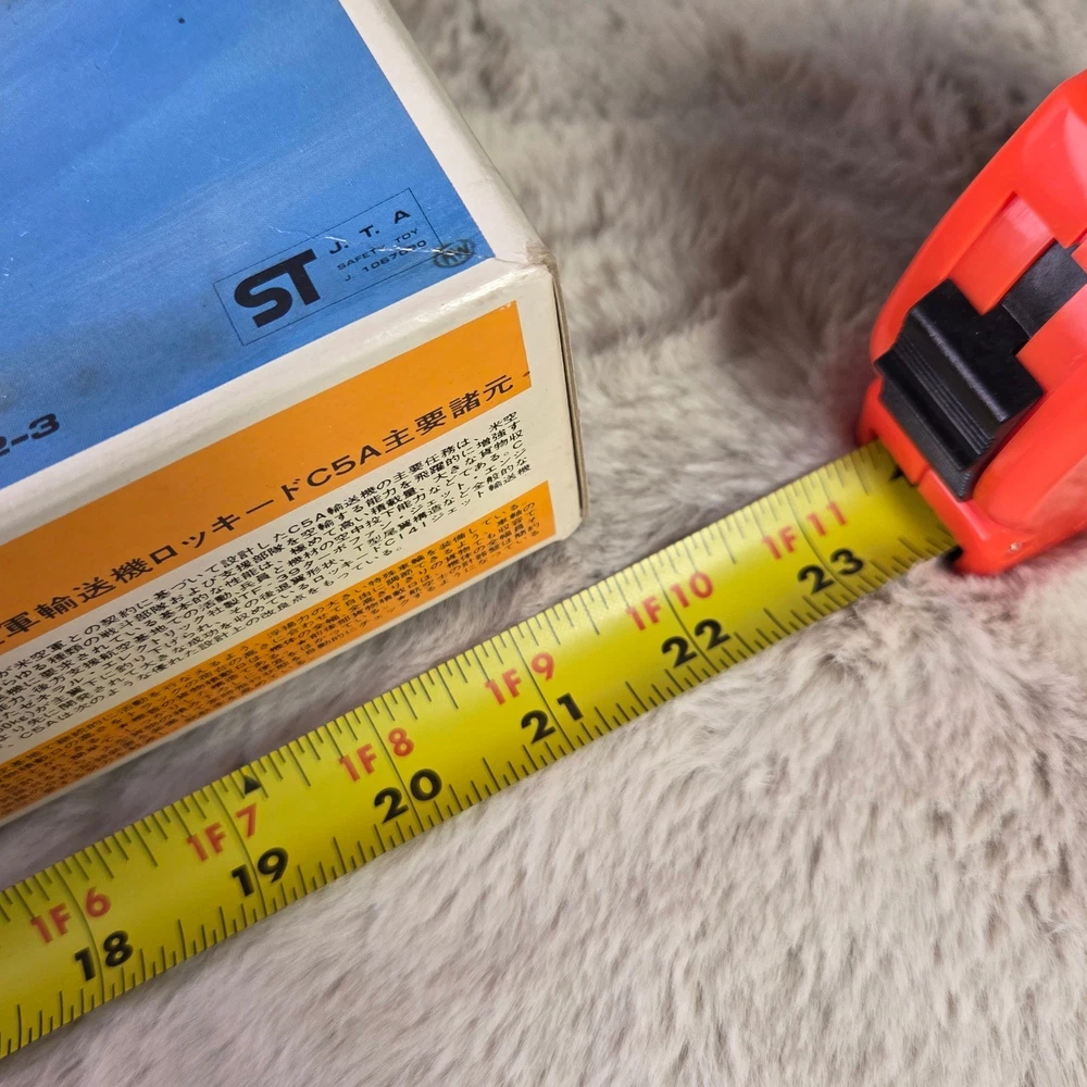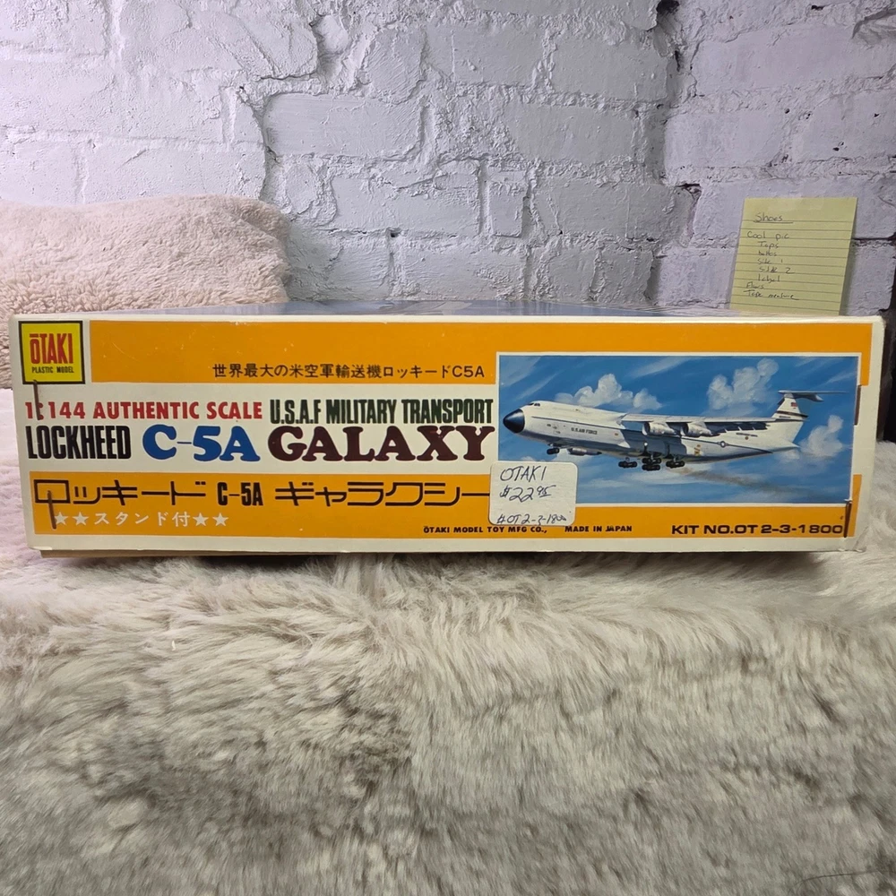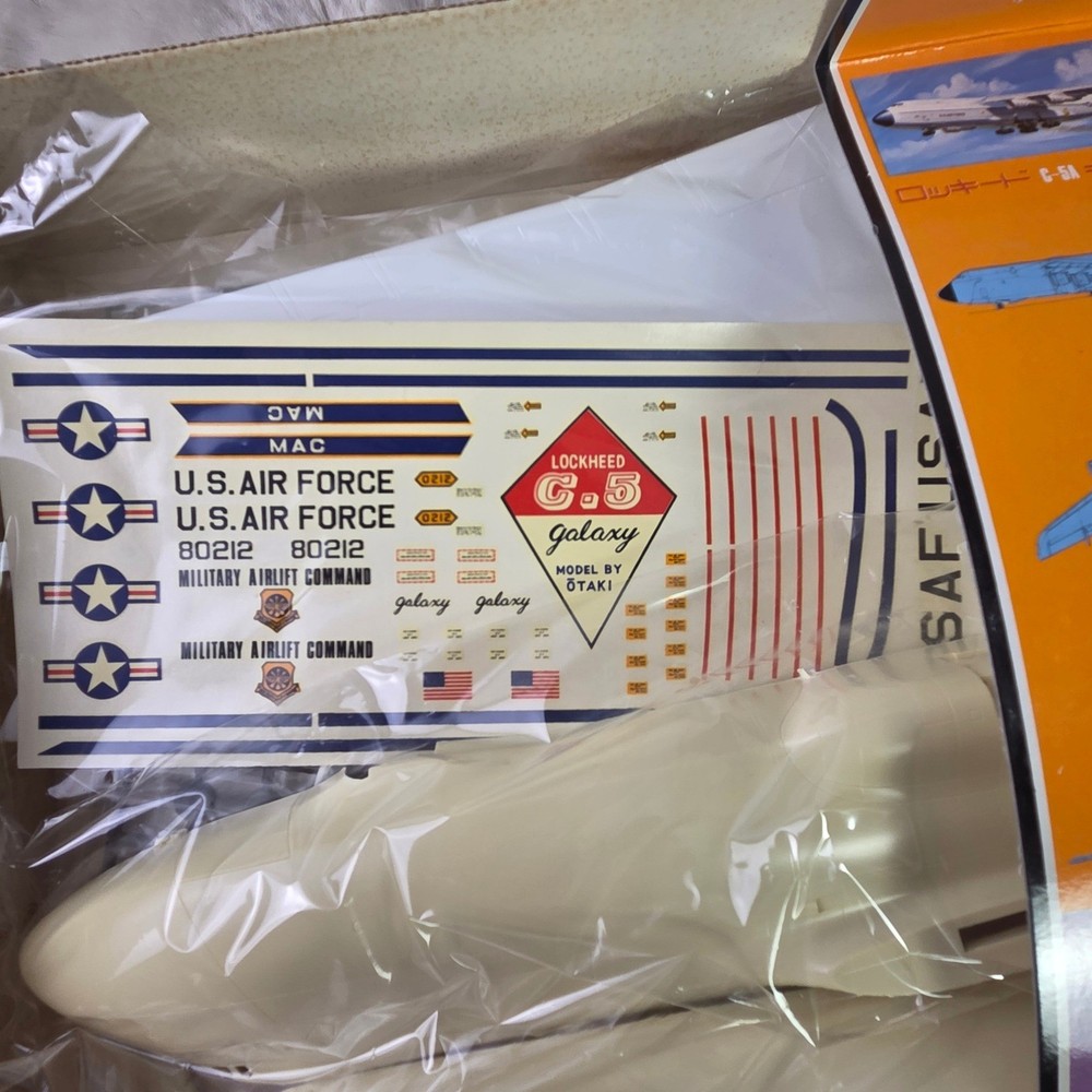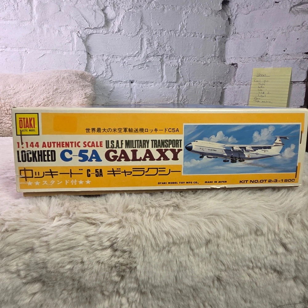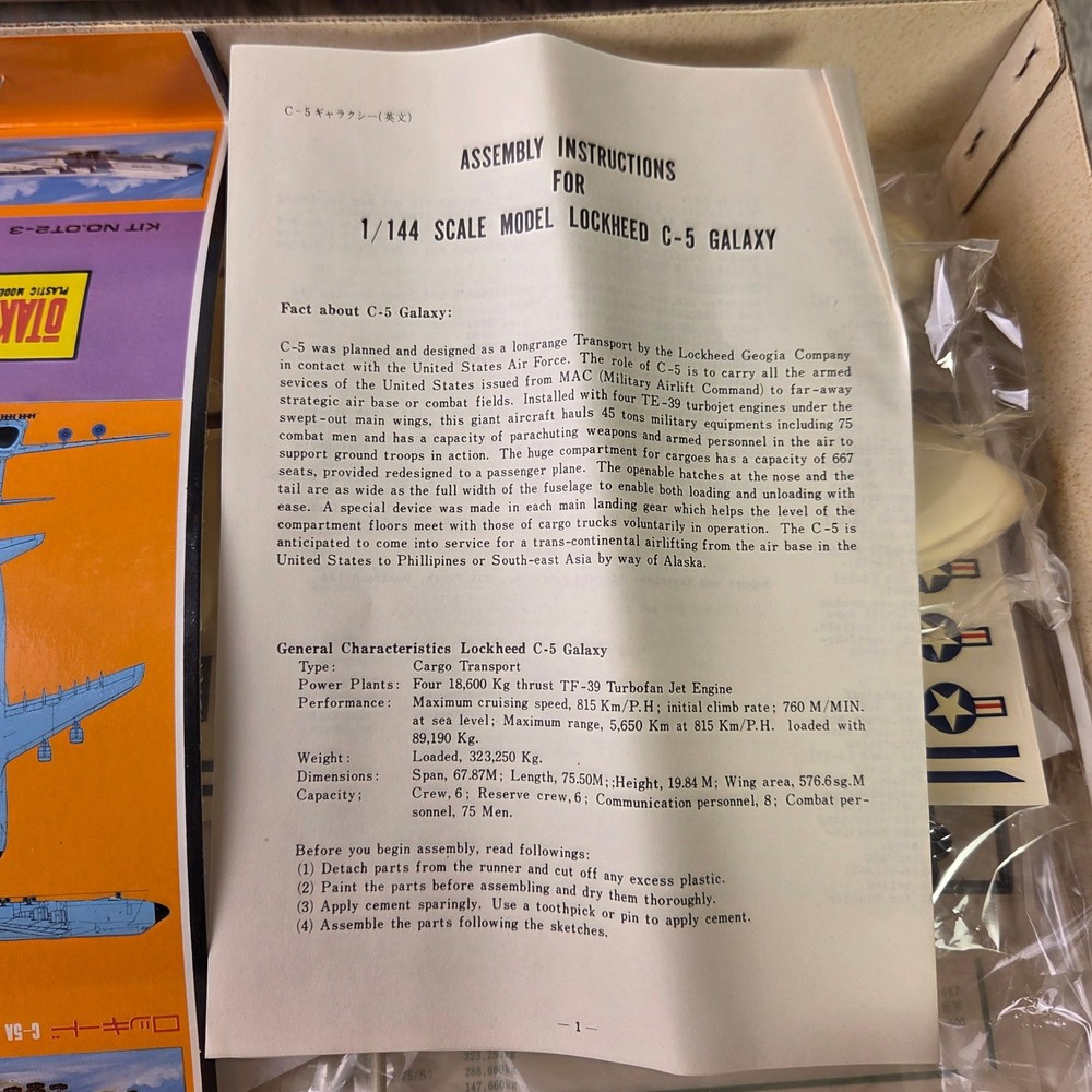 Otaki Lockheed C-5A Galaxy 1:144 scale plastic model kit features the iconic U.S.A.F. Military Transport aircraft. This authentic scale kit, manufactured in Japan, includes a display stand, assembly instructions, and a full set of Military Airlift Command decals. The internal components remain sealed in their original plastic packaging, ensuring all parts are preserved. A detailed instruction sheet provides historical facts and technical specifications for the C-5 Galaxy, making this a comprehensive project for aviation enthusiasts and model builders. Measurements: • Box Length: 23.5" • Box Width: 13" • Model Length (per box): 524mm • Model Wingspan (per box): 471mm