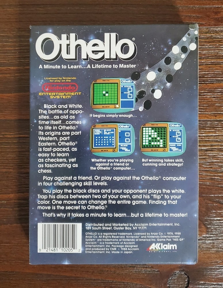 This product is a complete in box (CIB) authentic Othello video game for the Nintendo NES console. Published by Nintendo, the game falls under the strategy genre and has an E-Everyone rating. It includes the manual and features a circle seal, adding to its authenticity and collectability. The game is for NTSC-U/C (US/Canada) region consoles, making it a desirable addition for any video game enthusiast looking to expand their Nintendo NES collection.