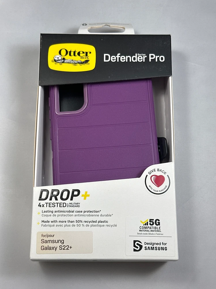 OtterBox Defender Pro Case for Samsung Galaxy S22 Plus - Happy Purple Experience ultimate protection with the Defender Series Pro Phone Case from OtterBox. This advanced case features a silver-based antimicrobial additive that prevents the growth of bacteria, ensuring 24/7 defense. With a rugged design and raised edges for camera and screen protection, this case is built to last. Included port covers keep out dust and dirt, while the versatile holster doubles as a kickstand. Get Pro Drop Protection for your device with Defender Series Pro.