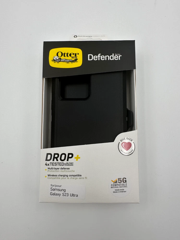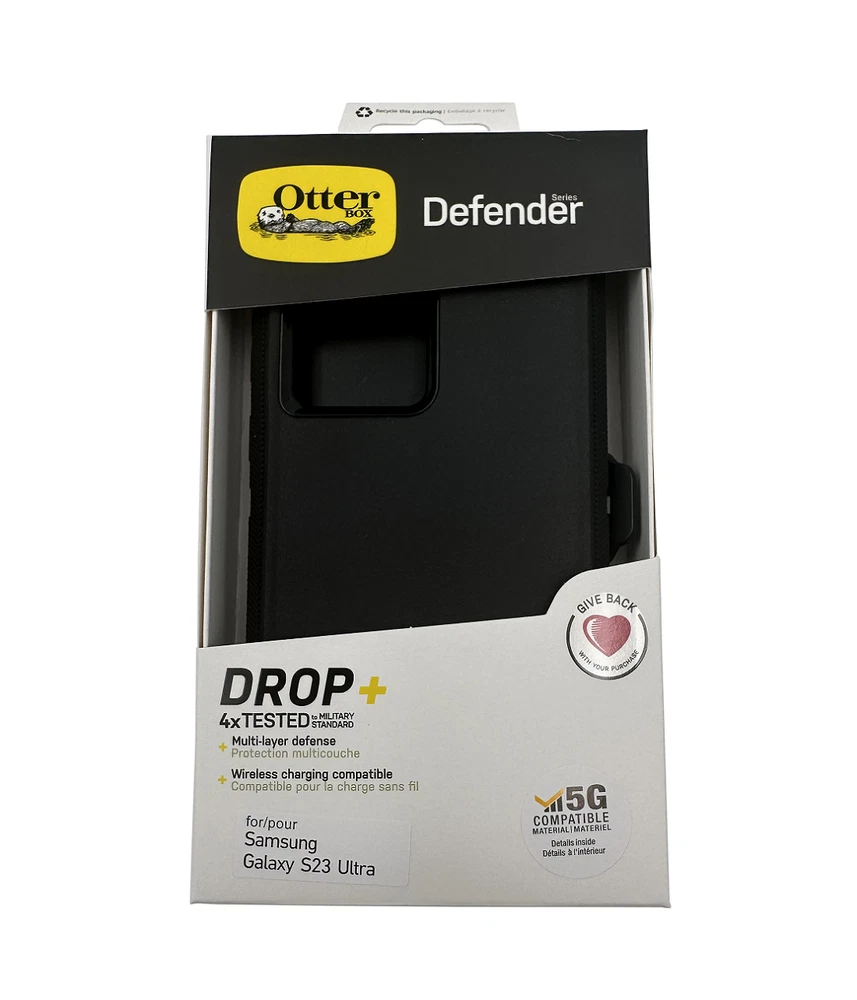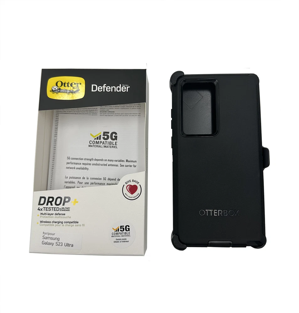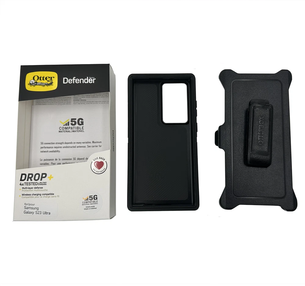 OtterBox Defender Pro Series Case and Holster For Samsung Galaxy S23 Ultra Black Defender Series for the Samsung Galaxy S23 Ultra provides advanced defense for your device. The rugged phone case integrates an antimicrobial additive that helps inhibit microbial growth and helps defend the case exterior against many common bacteria.The premium design displays clean lines with a comfortable grip, the raised edges protect the camera and screen and port covers block dust and dirt. Defender Series Pro also includes a versatile holster that clips to belts and bags and doubles as a hands-free kickstand. Defender Series Pro provides the intense drop protection you need to defend your everyday
