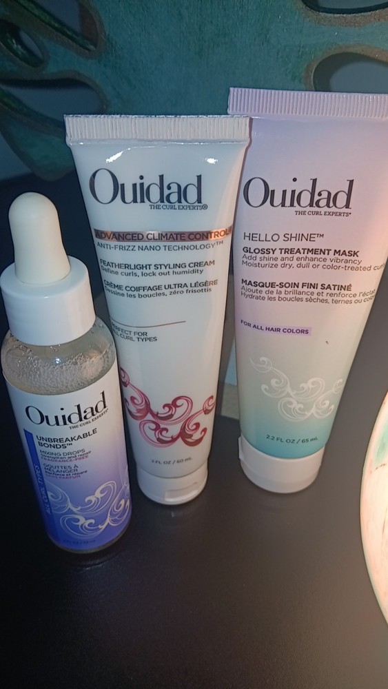 Lot includes NEW FULL SIZE Ouidad Unbreakable Bonds Mixing Drops 2 oz. Mixing Drops in with your styling products to strengthen and repair hair. Made for curls but can be used for all hair types NEW TRAVEL SIZES Advanced climate control anti frizz featherlight styling cream 2 fl oz Hello shine glossy treatment mask 2.2 fl oz