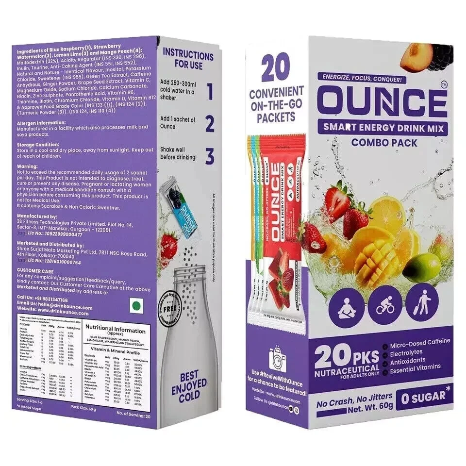 Ounce Energy Drink Powder + Electrolyte Powder - 20 Free Shipping World Wide About this item Healthy Energy Boost: Experience peak energy and focus without the crash or jitters. Ounce provides essential energy with B12 and a microdose of 40mg caffeine, making it ideal for those sensitive to caffeine or wanting to avoid jitters. It's functional energy crafted with premium ingredients. Convenient On-The-Go Solution: Enjoy the great taste and zero guilt with our tear-and-pour powder packs. Simply mix with 8-10 oz of water for an immediate, revitalizing, and delicious mental and physical energy charge. Unlike traditional energy drinks, our mix is sugar-free, making it a guilt-free choice. Compatible with keto, low-carb, paleo, gluten-free, and vegan diets. No soy, no dairy. Non-GMO. Electrolyte Replenishment: Each serving of our energy powder contains a balanced blend of Potassium, Sodium, Calcium, and Magnesium. With electrolytes and antioxidants, our energy drink mix supports proper hydration and muscle function. It's the perfect solution for athletes, travel days, busy families, students, or anyone in need of energizing hydration powder on the go. Essential Vitamin Infusion: Our energy drink powder packets are packed with B12 and multivitamin for men and women, providing a multi vitamin - rich hydration energy solution when added to water. These essential nutrients boost energy levels, support the immune system, and protect cells from damage. Get the vital nutrients your body needs for optimal performance. 100% Satisfaction: Your satisfaction is our top priority. If you're unhappy for any reason, please contact us directly, and we'll make it right. Reach out to us, and we'll take care of you. Safety Information: Not to exceed the recommended daily usage of 2 sachet per day. This Product is not intended to diagnose, treat, cure or prevent any disease. Pregnant or lactating wome or anyone with a medical condition consult with a physician before consuming this product. This product is not to be used as a substitute for a varied diet. Ingredients: Maltodextrin, Acidity Regulator, Inulin, Taurine, Anti-Caking Agent, Natural and Nature - Identical Flavour, Inositol, Potassium Chloride, Sweetener (INS 955), Green Tea Extract, Caffeine Anhydrous, Ginger Powder, Turmeric Powder, Grape Seed Extract, Vitamin C, Magnesium Oxide, Sodium Chloride, Calcium Carbonate, Niacin, Zinc Sulphate, Pantothenic Acid, Vitamin B6, Thiamine, Approved Food Grade Colour, Biotin, Chromium Chloride, Vitamin D and Vitamin B12 Directions: Simply mix with 8-10 oz of water for an immediate, revitalizing, and delicious mental and physical energy charge. Legal Disclaimer: Actual product packaging and materials may contain more and different information than what is shown on our app or website. We recommend that you do not rely solely on the information presented here and that you always read labels, warnings, and directions before using or consuming a product. Shipping All item will be shipped directly from MALAYSIA. Registered Post Item delivered will required signatures at the time of receiving. Dispatched items tracking number will be updated within 24 hrs. Of the dispatch. All items ordered will be dispatched within 48 hour after receiving the clear payment. All items require 15 to 30 business days to arrive at the given address. Please do not order if you are not willing to wait for above given time. All our items will be shipped worldwide, In any case the item is been stuck to the buyers custom department the buyer has to pay the custom charges for the receiving of the item. If you need express delivery we can arrange by DHL,Aramex,Fedex & UPS delivery time period 3-5 working days for more details please contact us through eBay message. *condition apply* SMS 395597042063 00122HAM