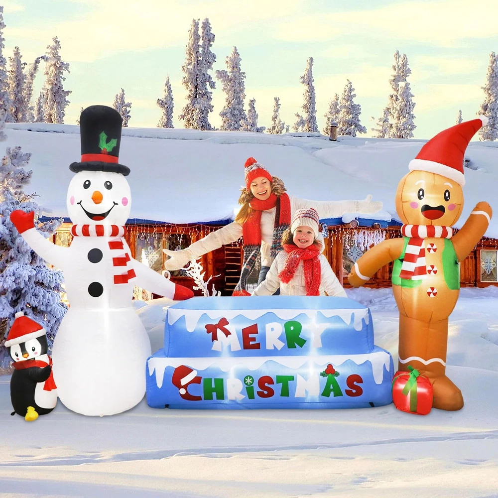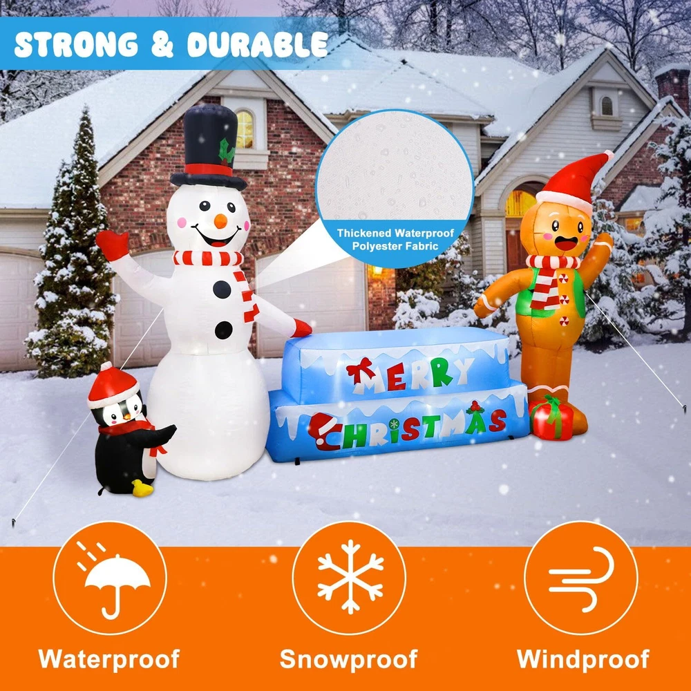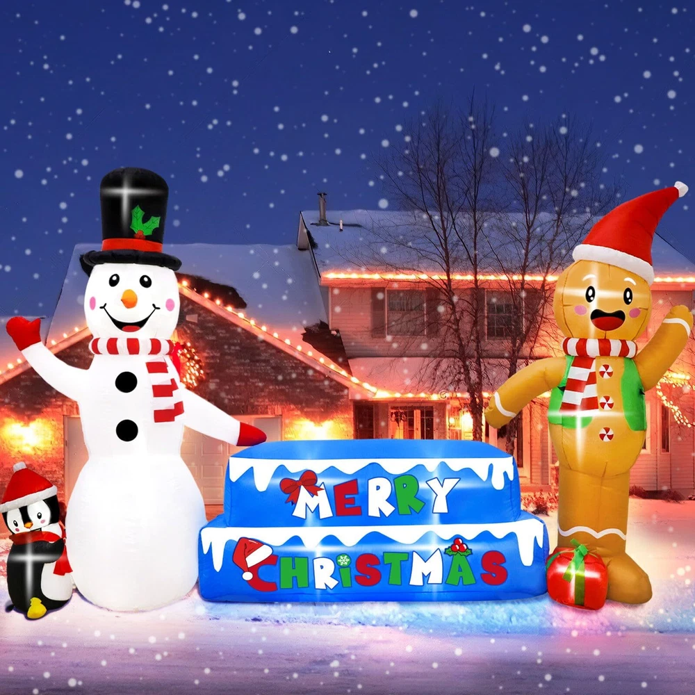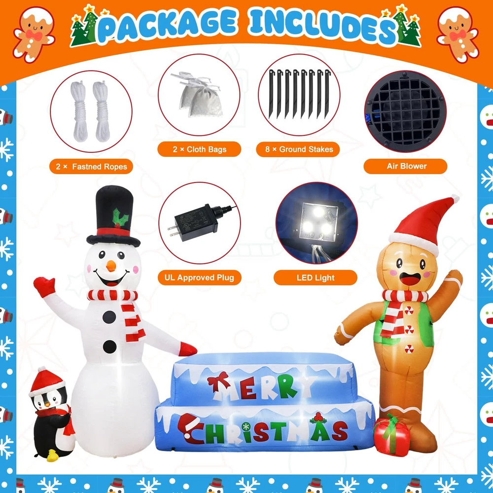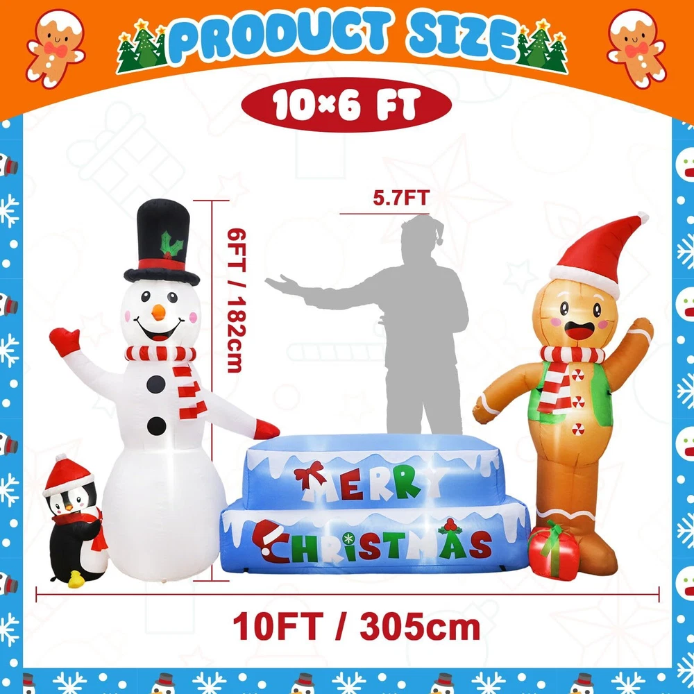 【Christmas Inflatable Snowman & Gingerbread Man】OurWarm Christmas blow up yard decorations with snowmen, gingerbread men, penguins, ice cubes, and Merry Christmas, are the most popular elements of Christmas decor, let it make your Christmas more colorful! 【Steady Christmas Inflatables】Each gingerbread man & snowman inflatable comes with two 2 m long windproof ropes, 8 ground stakes, and 2 sandbags, they can help you better fix Christmas blow up yard decorations, even in winter, don't worry it will be blown over by the gusty wind! 【Perfect Outdoor Christmas Decorations】This 10 FT × 6 FT inflatable snowman & gingerbread Man is perfect for Christmas decorations. Inflatable Christmas decorations built-in 7 bright LED lights, the effect looks great both indoors and outdoors, day and night! 【Premium Material & Fine Workmanship】Our snowman inflatable Christmas decorations are made of thick waterproof polyester which is safe and harmless. Purely handmade with tightly sewn edges, bright colors, and a huge appearance, all the kids will fall in love with it at first sight! 【Easy to Install & Store】The Christmas inflatables outdoor decorations come with a blower, all you need to do is place it in an open field and plug it in, it will inflate in a minute, when you don't need it, unplug it and it deflates, doesn't take up much space for easy storage.