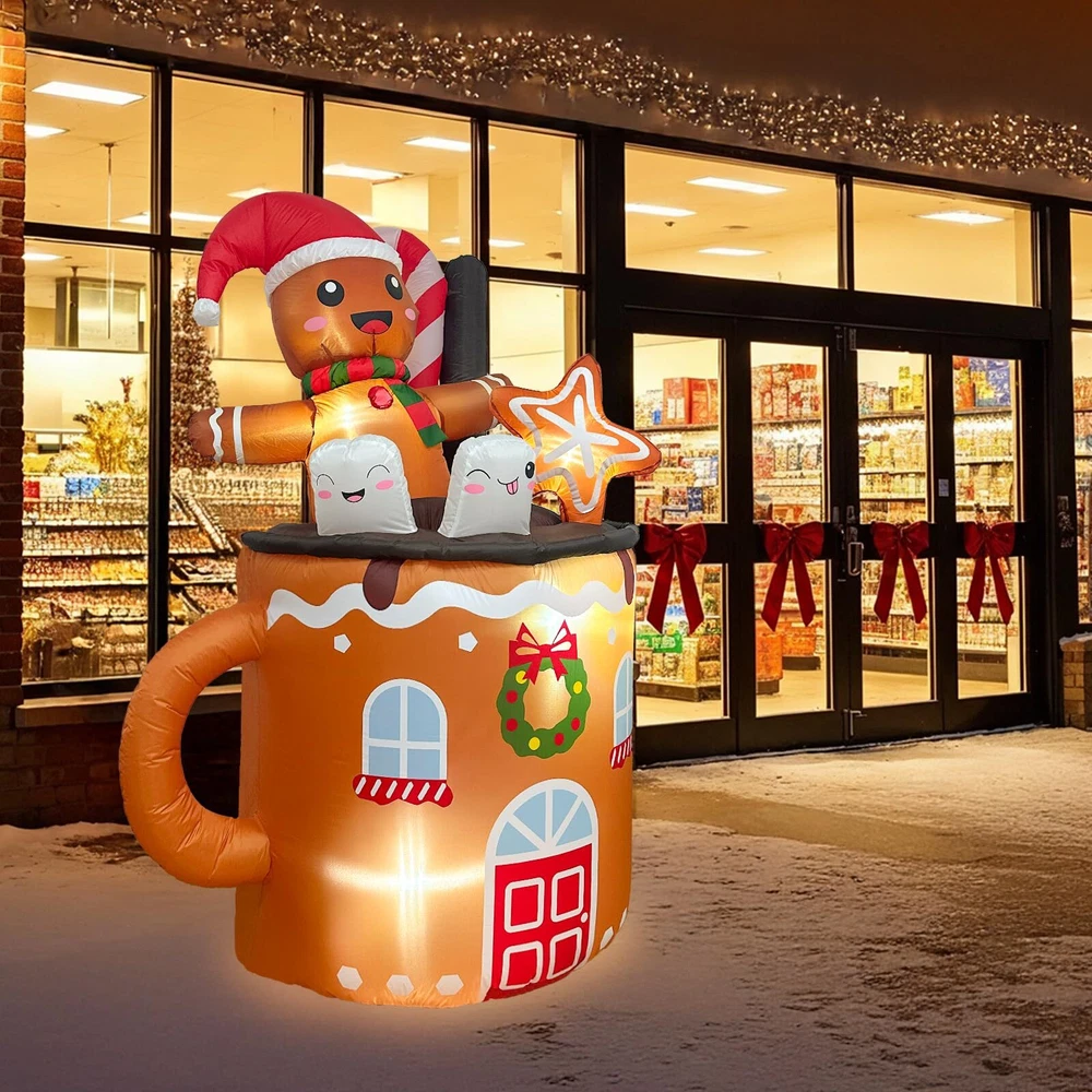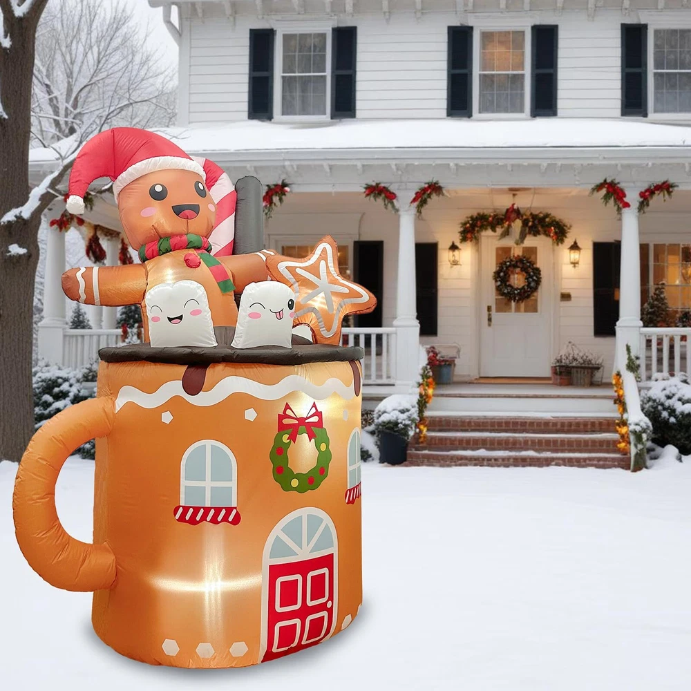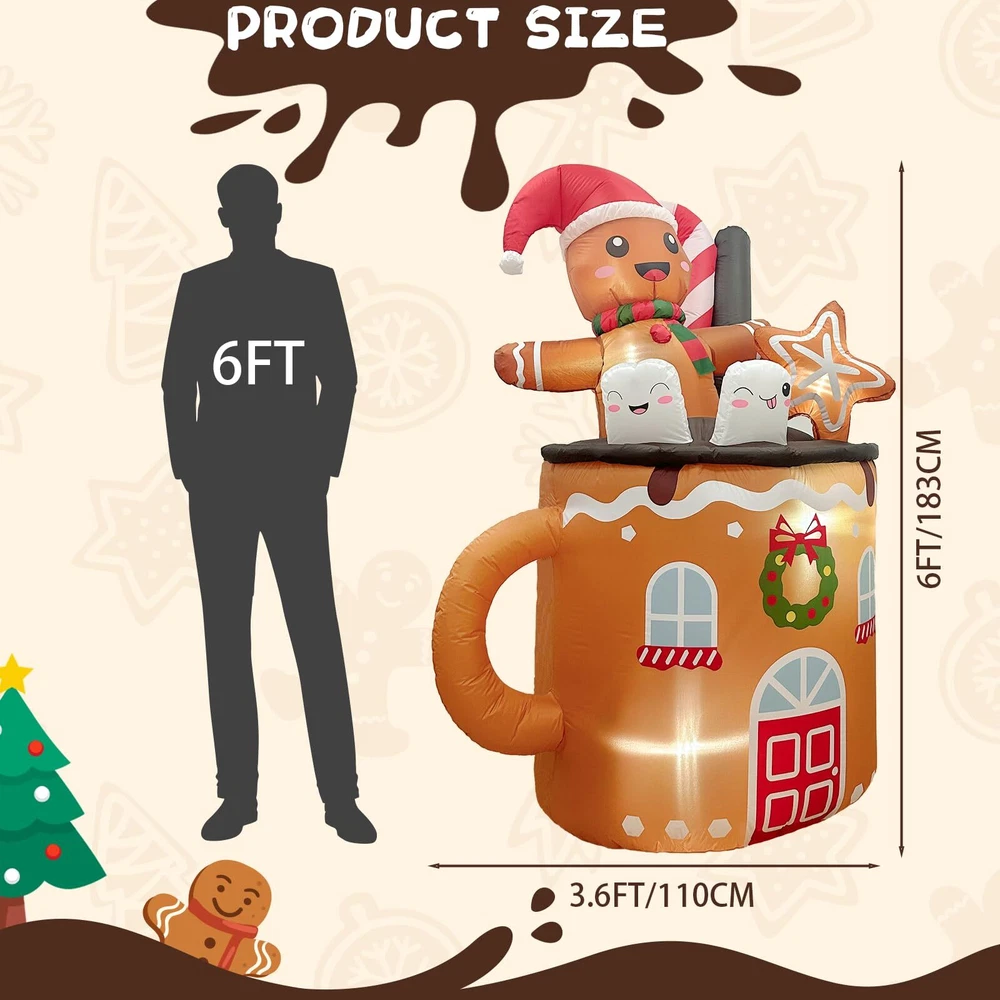 Whimsical Design: The OurWarm Christmas blow ups feature an adorable gingerbread man lounging in a hot cocoa mug. This charming design, measuring 6ft tall, creates a festive and whimsical atmosphere for your yard, garden, or lawn. The gingerbread man's joyful expression adds a playful touch, making it a standout piece for your holiday decor Secure and Stable Installation: The package includes four ground stakes, and two 59-inch fastened ropes, ensuring that the Christmas outdoor inflatables stay securely in place. These accessories provide stability, preventing the decoration from toppling over or blowing away in windy conditions. You can confidently display the gingerbread man in a hot cocoa mug Energy-Efficient LED Lights: Our Christmas decorations outside inflatable are equipped with four energy-saving LED lights, enhancing their visibility and charm, especially at night. These bright, efficient lights make the decoration shine, creating a warm and inviting holiday atmosphere in your outdoor space. The energy-saving feature ensures that you can enjoy the festive display without worrying about high electricity bills Quick and Easy Inflation: The gingerbread inflatables outdoor decorations are equipped with a built-in 0.85A blower, ensuring it inflates quickly and efficiently. The process is hassle-free, allowing you to set up your festive display in no time. The 1A UL-approved plug with a 70.8-inch long power cord provides ample flexibility for placement, eliminating the need for extension cords and making setup even more convenient Durable and Weather-Resistant: Made from high-quality 190T polyester materials, this inflatable decoration is designed to withstand various weather conditions. Its durable construction ensures gingerbread inflatable remains in excellent shape throughout the holiday season. The weather-resistant fabric protects gingerbread Christmas decorations from the elements, allowing you to enjoy this charming decoration year after year