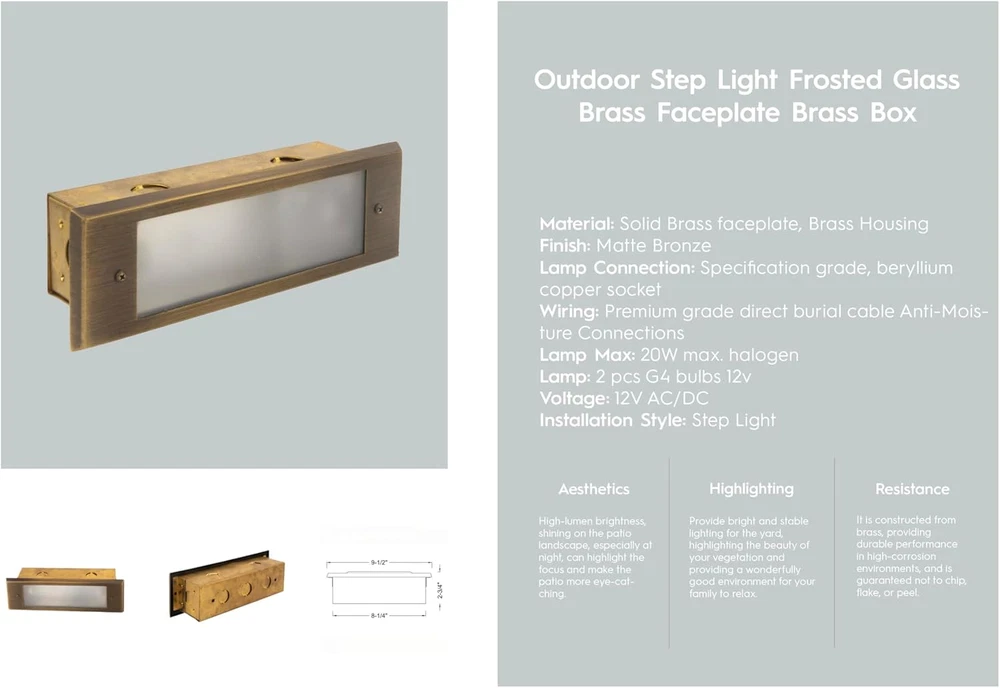 12V low voltage outdoor step light, perfect for outdoor lighting Frosted glass lens provides a soft, diffused light that is ideal for outdoor spaces Solid brass faceplate and mounting plate for durability and corrosion resistance IP65 waterproof rating for outdoor use Easy to install with included mounting hardware This Outdoor Step Light is a perfect addition to any outdoor space, providing ample lighting for safety and security. It is made of durable solid brass and features a frosted glass lens that creates a soft, warm glow. The light is designed to withstand the elements, making it ideal for use in any weather condition. With its low voltage design, it is easy to install and can be used to illuminate pathways, steps, patios, and gardens. The solid brass faceplate adds a touch of elegance and sophistication to the light. Whether you want to create a cozy atmosphere for outdoor entertaining or simply improve the safety and security of your home, this Outdoor Step Light is a great choice.