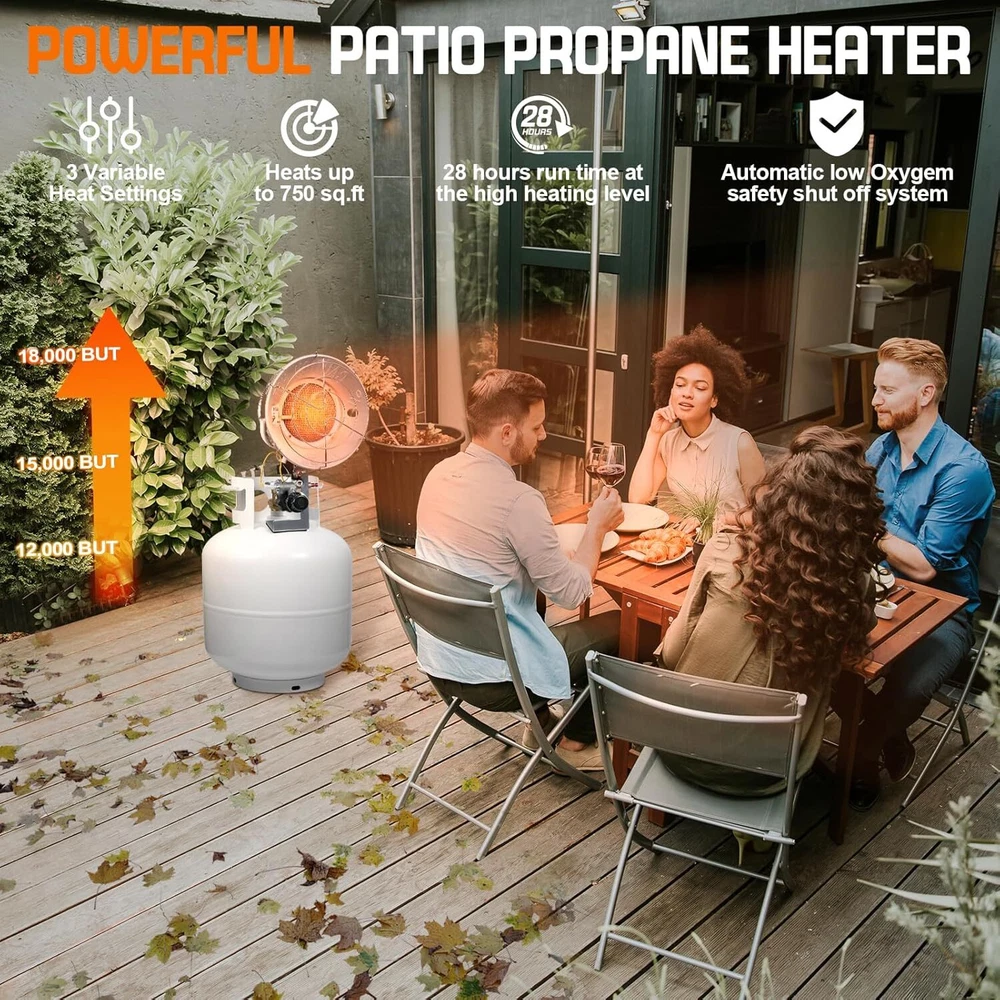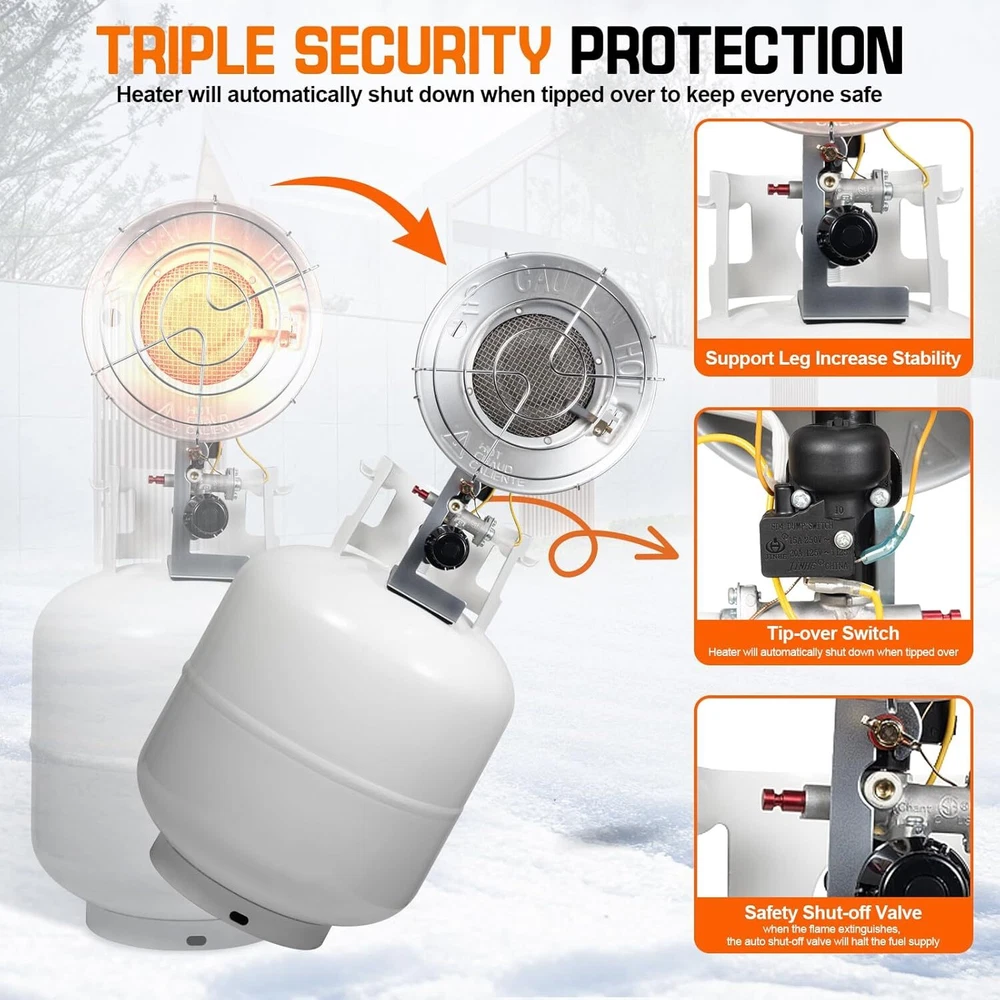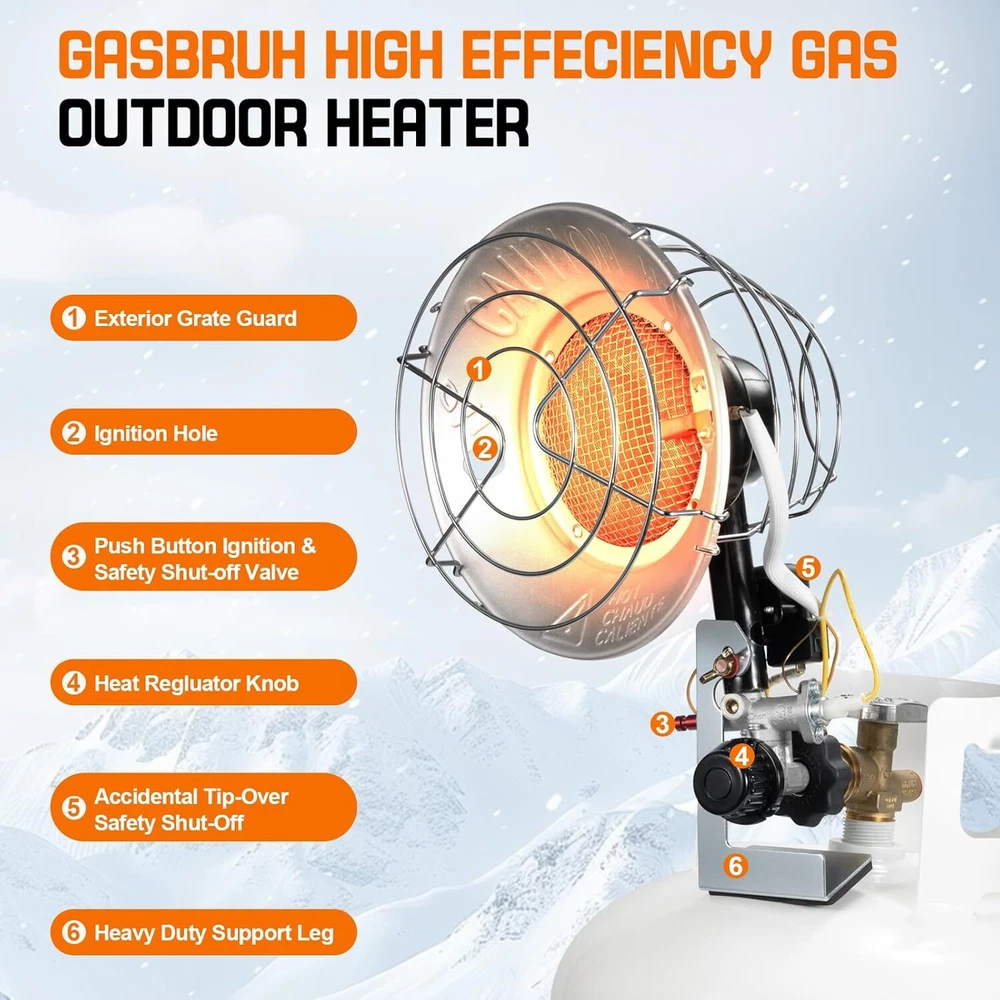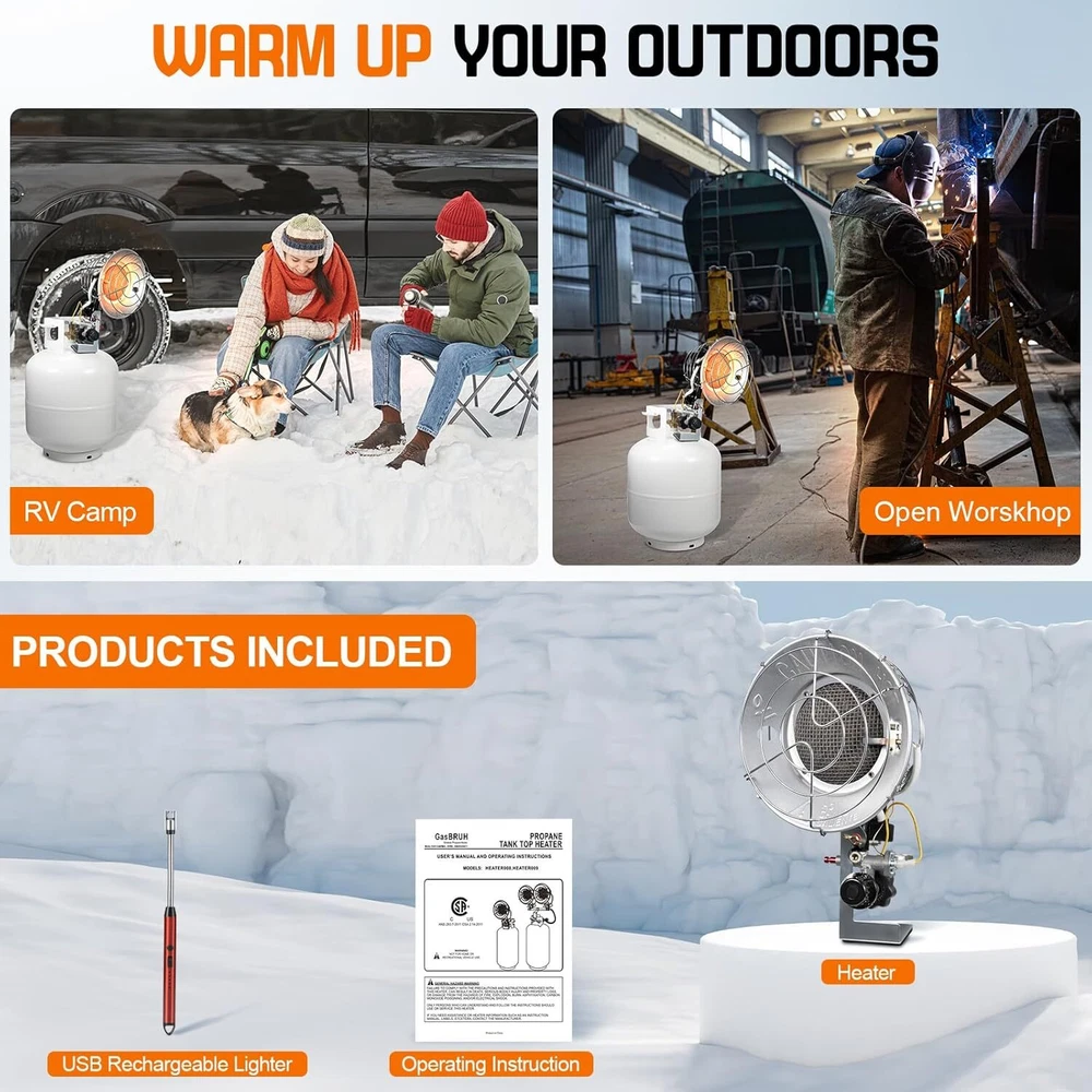 Under Desk Foot Warmer Silent Personal Space Heater With Thermostat and Timer 73.86 USD 77.75 USD Free shipping 5% off Digital Display Ceramic Heater 750W Wall Outlet Plug-in Space Heater White 44.95 USD 47.32 USD Free shipping 5% off 1500W Portable Ceramic Space Heater with Thermostat Tip-Over Overheat Protection 39.72 USD 41.81 USD Free shipping 5% off Portable Oscillation Space Heater 1500W PTC Ceramic Electric Heater w/Thermostat 52.24 USD 54.99 USD Free shipping 5% off 1500W Space Heater, Portable Electric Heater Heat Up 200 Square Feet for Indoor 48.92 USD 51.49 USD Free shipping 5% off 2PCS Milkhouse Space Heater 1500W Electric Heater w/Thermostat 3 Heat Settings 91.19 USD 95.99 USD Free shipping 5% off Heated Floor Mat Foot Warmer Under Desk 19.7x21.7in Heated Feet Rest Home Office 47.69 USD 50.2 USD Free shipping 5% off Portable Electric Space Heater w/Thermostat Overheat Protection Energy Efficient 40.86 USD 43.01 USD Free shipping 5% off Cat Water Fountain w/Water Level Window 3.2L Stainless Steel Auto Water Fountain 45.59 USD 47.99 USD Free shipping 5% off 4L Automatic Cat Feeder WiFi Automatic Cat Food Dispenser w/APP Feeding Control 40.86 USD 43.01 USD Free shipping 5% off 4L Automatic Cat Dogs Water Dispenser with Placemat and Stainless Steel Bowl 40.86 USD 43.01 USD Free shipping 5% off 37"Cat Scratching Post Sisal Rope Scratcher with Dangling Teaser Ball/Covered 37.44 USD 39.41 USD Free shipping 5% off About this item Please Note : Propane Tanks are Not Included. Please ensure this propane heater is kept away from any flammable materials. Powerful Propane Heater: Our propane garage heater featuring advanced heating technology offers 3 heat settings—low (12,000 BTU), medium (15,000 BTU), and high (18,000 BTU)—and provides up to 28 hours of use on a 20 lb propane cylinder (on the high setting). This garage heater quickly and efficiently warms your outdoor area, keeping you comfortable and cozy even in chilly weather. Propane Tank Heater with a windproof lighter: As an added bonus, our single tank top propane radiant Heater includes a USB windproof lighter, making it easy to ignite the heater, even on windy days. This lighter eliminates the need for traditional lighters and can also be used to ignite candles and fireworks with ease. Safety Propane Tank Top Heater: This camping heater features safety mesh guards designed to prevent burns. It includes a tip-over switch that automatically shuts off the gas flow if the heater is accidentally knocked over. The safety stop valve will cut off the gas flow when the heater is extinguished. Certified by the CSA, this propane heater undergoes rigorous inspection to ensure it meets the highest safety standards, giving you peace of mind during use. Durable Construction Gas Heater: Our propane gas heater is constructed from high-quality, heavy-duty metal and features an all-aluminum reflector design, ensuring durability in various outdoor environments. It delivers reliable performance in all weather conditions, rain or shine. The brass connector between the hose and gas cylinder prevents gas leaks, enhancing safety. Easy to use Propane Patio Heater: The propane heater comes pre-assembled and can be easily attached to a 20 lb propane tank (not included) using the mounting bolt knobs. To ignite, press the safety shut-off valve and insert the included USB lighter through the ignition hole in the metal plate for a quick and safe start. Our propane heater is an ideal gift for outdoor enthusiasts, patio, garage, RV travele. CSA Certified Propane Tank Heater: GasBRUH single tank top propane propane radian heater is CSA certified and crafted with high-quality materials, ensuring its durability and safety during use. You may also like Outdoor Garden Hose Storage Pot Decorative w/Drainage Hole Hose Holder Patina US 85.49 USD 89.99 USD Free shipping 5% off Angle Head F1807 PEX Pipe Crimping Tool for Copper Rings 1" Angle Single Crimper 79.76 USD 83.96 USD Free shipping 5% off 18in Ceramic Christmas Tree Pre-lit Hand-Painted Tabletop Holiday Decor Tree US 91.19 USD 95.99 USD Free shipping 5% off US Foldable Walker with Seat Aluminum Rollator Walker 8" Big Wheels for Seniors 102.59 USD 107.99 USD Free shipping 5% off 3/8" Drive Impact Socket Set 48-Piece SAE/Metric Deep/Shallow Sockets Cr-V Steel 51.29 USD 53.99 USD Free shipping 5% off 208 Piece Tool Set Household Hand Tool Kit Auto Repair Tool Box for Home Repairs 68.39 USD 71.99 USD Free shipping 5% off 3-Shelf 3-Door Multi-purpose Cabinet Pantry Storage Cupboard Organizer Bookcase 43.74 USD 46.04 USD Free shipping 5% off 12V Coffee Maker with Glass Carafe & Stop-Drip Interrupt Feature for Office US 42.83 USD 45.08 USD Free shipping 5% off 301B Light Air Die Grinder 1/4"Right Angle 21000 RPM Ball Bearing Construction 62.35 USD 65.63 USD Free shipping 5% off 12 Inch Nonstick Deep Frying Pan Granite Stone Saute Pan for Cooking with Lid 45.49 USD 47.88 USD Free shipping 5% off 1 Person Emergency Food Supply Kit 42 Serving Storage Quick Meal Survival Bucket 33.73 USD 35.5 USD Free shipping 5% off 6.5Ft Beach Umbrella w/UV Protection &Matching Case Sun Shade Outdoor Umbrella 28.67 USD 30.18 USD Free shipping 5% off