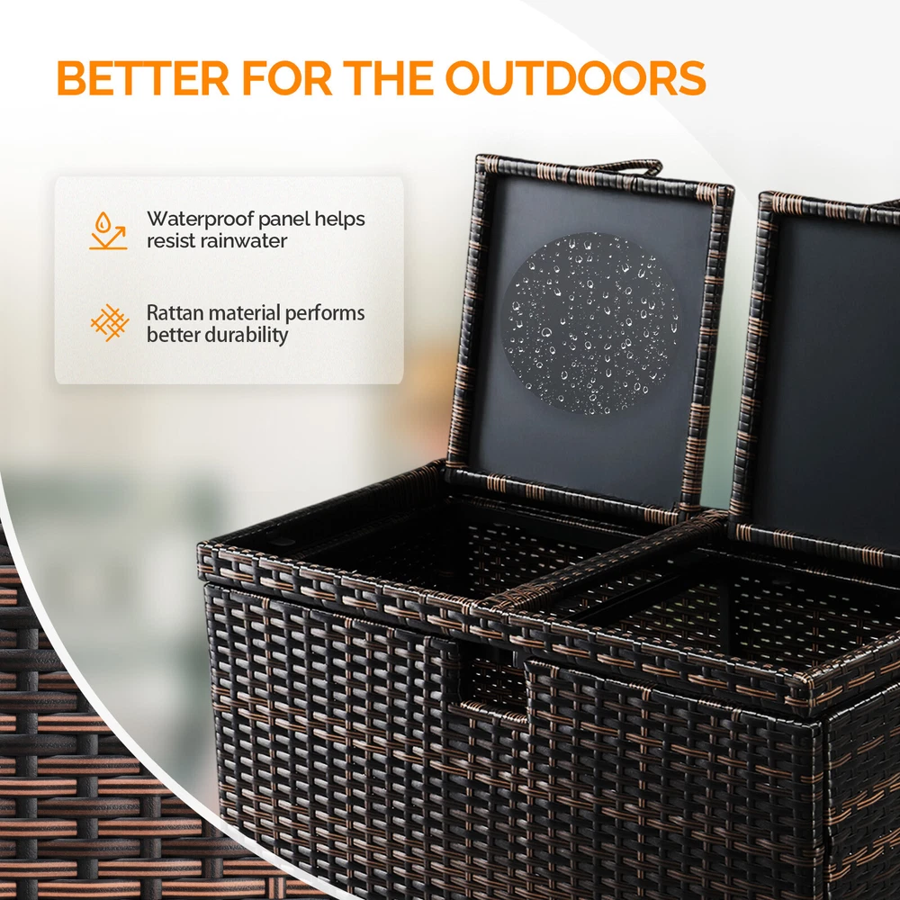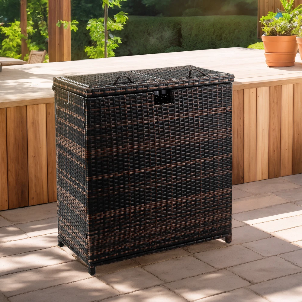Introductions: Keep your outdoor and indoor spaces clean and stylish with our 72-gallon large wicker trash bins. Designed for durability and functionality, this trash can features a dual-lid design to separate and organize waste, making it perfect for managing trash at parties or daily use. Its UV-resistant PE rattan and sturdy steel frame ensure-lasting performance in all weather conditions. With thoughtful details like adjustable feet, easy-to-replace trash bags, and a modern wicker texture, this trash bin seamlessly combines practicality and elegance for any porch, patio, backyard, or commercial space. Features: 1. Massive 72-Gallon Capacity with Dual Lids: Keep your trash organized with dual compartments, perfect for separating recyclables from waste or managing large amounts of trash effortlessly. Ideal for gatherings, parties, or everyday use. 2. Durable Construction for All-Weather Use: Made from UV-resistant PE rattan and a sturdy steel frame, this trash bin resists fading, rust, and wear, ensuring-lasting use both indoors and outdoors. 3. Convenient Design: A cutout under the lid makes trash bag replacement quick and simple. Each lid is equipped with lift handles for easy access, while adjustable feet ensure stability on uneven surfaces. 4. Elegant and Modern Design: Featuring a textured wicker surface and sleek, polished look, this trash bin seamlessly blends functionality with aesthetic appeal, making it a perfect addition to any outdoor or indoor space. 5. Versatile Indoor and Outdoor Use: Whether it's for your patio, porch, backyard, or even your kitchen, this dual-lid trash bin is a practical solution for keeping your spaces clean and organized while enhancing the décor. Specifications: 1. Dimensions: (30.7 x 16.1 x 33.9) in / (78 x 41 x 86) cm 2. Interior Bin Dimensions: (28.7 x 14.2 x 29.9) in / (73 x 36 x 76) cm 3. Iron Dimensions: (14 x 14 x 0.8) in / (35.5 x 35.5 x 2) cm 4. Lid Dimensions: (13.6 x 14.4 x 0.8) in / (34.5 x 36.5 x 2) cm 5. Hole Dimensions: (3.1 x 2.8) in / (8 x 7) cm 6. Material: PE Rattan, Steel 7. Net Weight: 26.9 lbs / 12.2 kg Package Includes: 1 x Wicker Trash Bin