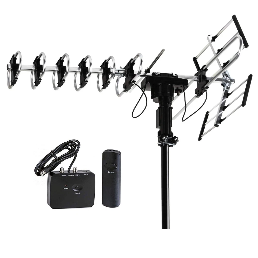 [Product Content] Package only included Antenna, Control Box, Remote Control, Power supply, 40ft RG6 Coaxial Cable, and Instruction (Mounting Pole is not included) "Auto Gain Control": Gain 15-35db, New technology for adjusting high quality signal reception performance. Built-in Super Low Noise Amplifier: Operating Frequency 45-860MHz. Built-in LTE filter which removes the interference caused by 4G phone signals and ensure the noise-free digital TV reception. Full band DTV/VHF/UHF Receiver: Supports 4K HD TV, 1080p,1080l, 720p Broadcast, Radio. 360 Degree Rotation. US, Canada, Mexico, Latin America and around the world Free up to 200 Local HDTV Channels for $0/Month Benefits: Two extra UHF elements and Up to 50% larger VHF elements to enhance the UHF/VHF channel reception and better image quality. Up to 25% more reflected area to enhance the receptions for all Channels. High quality copper cable to enhance the signal transmission from antenna to the receiver. Special wind proof design to enhance the durability of the Antenna. By using much higher quality material to make this antenna to last longer in all weather conditions.