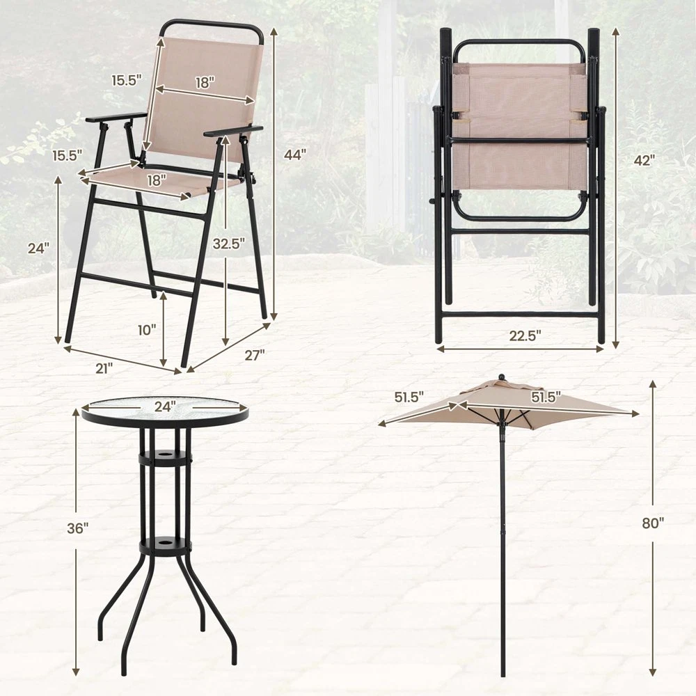 Store New Arrivals Add to Favorite View Feedback Contact Outdoor Bistro Bar Table And Chairs Set Of 2 With Patio Umbrella Clearance Sale Description Umbrella Size 51.5'' x 51.5'' x 80'' Chair Size 21'' x 27'' x 44'' Table Size 24'' x 24'' x 36'' Assembled Product Weight 38 lb Finish Beige Manufacturer Part Number NP11358BE Color Beige / Black Assembled Product Dimensions (L x W x H) 24.00 x 24.00 x 36.00 Inches Set Includes Table Chair Color Beige Number of Items in Set Four-Piece Cushions Included N Enhance your outdoor space effortlessly with our all-inclusive patio furniture set! Boasting a cool square umbrella that shields you from relentless sun rays while letting refreshing breezes flow through, it's a true summer essential. And that's not all - our innovative folding bar chairs maximize space usage without sacrificing an ounce of comfort, thanks to their ergonomic design. Meanwhile, the covered fabric is breathable, quick-drying, fade-resistant and sun-proof, ensuring long-lasting comfort and durability. Crafted from robust, weather-resistant materials, this stunning set stands up to Mother Nature's whims, promising years of enjoyment on any occasion. Assembling it is a breeze, as the umbrella is designed with spring button for easy assembly, and the assembly-free folding chairs open up in seconds. Don't miss out on this ultimate ticket to upscale alfresco living! Feature With ventilated, waterproof and sun-proof umbrellas for outdoor enjoyment Removable umbrella fitted in the built-in umbrella hole can be used separately High-top bar table with 2 fixing brackets to further keep the umbrella in place Heavy-duty metal frame with non-slip feet prevents slippery and floor scratches Round tempered glass tabletop is durable in use and easy to clean Folding chair for space-saving storage during the off-season Ergonomic design allows for maximum comfort Quick-drying and fade-proof fabric makes it easy to maintain Specification Color: Beige and Black Material: Fabric, Metal, Tempered Glass, Polyester Overall Dimensions of Table: 24'' x 24'' x 36'' (L x W x H) Dimensions of Umbrella: 51.5'' x 51.5'' x 80'' (L x W x H) Umbrella Hole Diameter: 1.6'' Dimensions of Chair: 21'' x 27'' x 44'' (L x W x H) Folding Size of Chair: 22.5'' x 3'' x 42'' (L x W x H) Seat Dimensions: 18'' x 15.5'' (L x W) Seat Height: 24'' Width of 2 Armrests: 21'' Armrest Height: 32.5'' Backrest Width:18'' Footrest Height: 10'' Weight Capacity of Tabletop: 110 lbs Weight Capacity of Chair: 330 lbs Net Weight of 4 PCS: 38 lbs Package Includes: 1 x Bar Table 2 x Folding Bar Chairs 1 x Umbrella 1 x Instruction Exceptional Comfort: The outdoor patio furniture set comes with a 51.5'' x 51.5'' square umbrella that provides ideal protection from the scorching sunlight. Meanwhile, the ventilated 2-tier top promotes air circulation and maintains a cool ambience. Folding Bar Chairs: The bar set includes 2 folding counter height chairs that save space when not in use. Remember to fix the frame by the safety buckle! Besides, the ergonomic chair with integrated armrests and comfortable footrest will give you true relax. Weather-resistant Material & Durable Construction: The 4pcs patio set with umbrella is made from all-weather fabric and heavy-duty metal, which are built to withstand the elements, ensuring long-lasting use and year-round comfort. Versatile & Functional Set: Whether you're hosting a small get-together or simply relaxing with a good book, the outdoor bar table set offers versatile seating options, allowing you to create the perfect outdoor oasis for any occasion. Easy to Assemble & Maintain: With a hassle-free assembly process, this patio set can be set up in minutes. In addition, fitted with textured high-quality tempered glass, the bar table's top adds a modern elegance and allows easy cleaning. ABOUT US We offer the best prices around on high quality products. Our E-store includes media such as books, movies, music and games while offering electronics, toys, sporting apparel, clothing, tools, general home, garden items and more. SHIPPING We are always working hard to ensure your package arrives as soon as possible. Please understand that some factors like weather, high postal traffic, and the performance of shipping companies are outside of our control. We offer free shipping to the lower 48 states and ship within 2 business days of payment, usually sooner. We do not accept P.O. Boxes. Please provide a physical address. For shipping outside of the continental USA, we only use eBay's Global Shipping Program.The item is shipped to KY and then sent to the rest of the world. International customers are responsible for all duties and taxes. Continue to check out in order to calculate costs for shipping the item to your country. Messages regarding eBay's Global Shipping Program MUST be directed at eBay EXCLUSIVELY. RETURNS We offer a 30-Day Return Policy on items which you are not completely satisfied with. You have the option for a full-refund or an exchange of the item. No returns are available on items shipped outside of the USA. PAYMENT We accept PayPal. CONTACT US This page content is yet to come Please ad us to your favorite seller and visit again later Thank You CUSTOMER SATISFACTION We try our very best to make sure every customer is completely satisfied. If there's a problem, message us! We're happy to help. WE ACCEPT Copyright © 2021 AutoDS. | All Rights Reserved