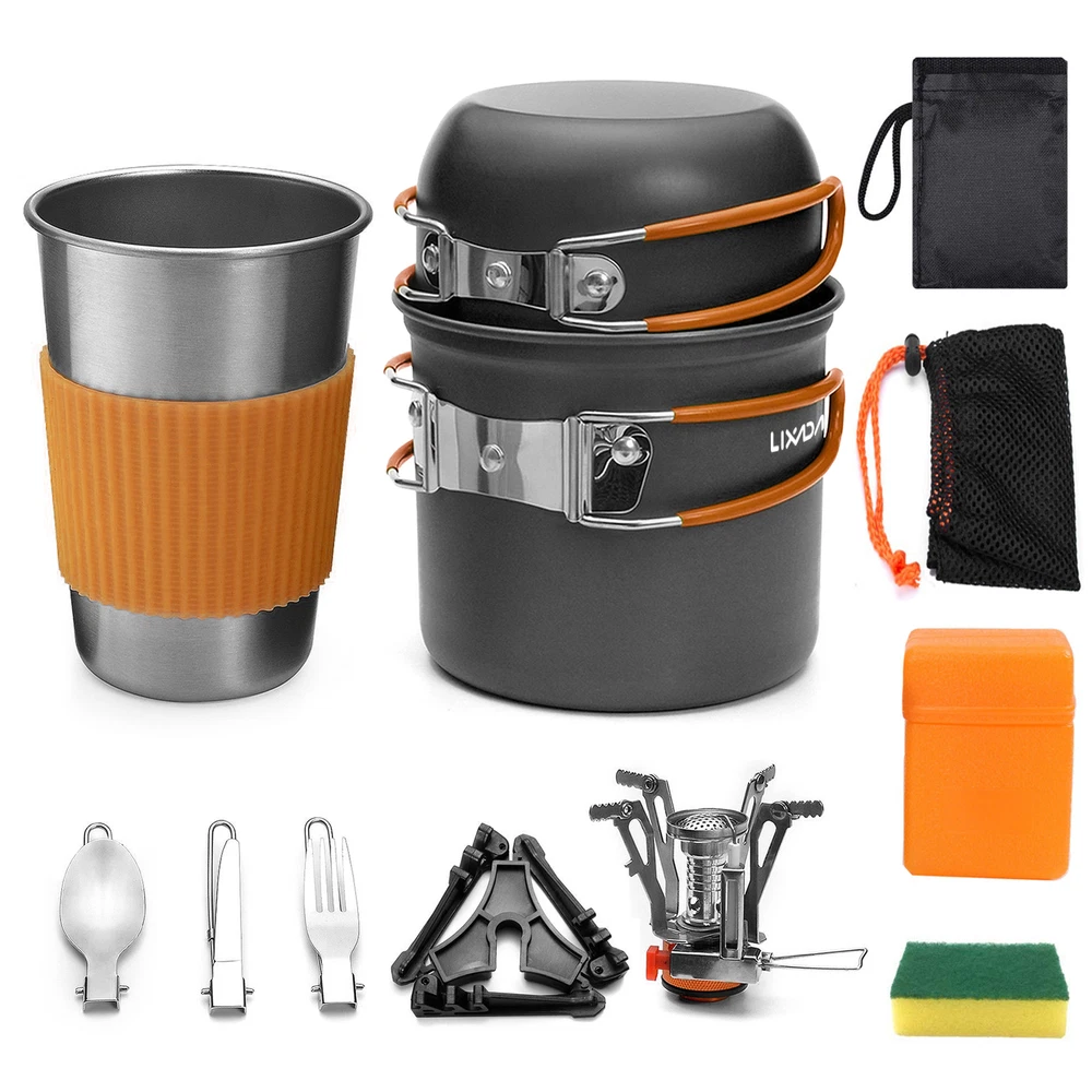 This camping cookware set is perfect for backpacking, hiking, emergency preparedness, and so on. And when you're not using it, it's incredibly easy to store thanks to its compact design. Features: Our camping pots and pans set conducts heat quickly and is easy to clean. Perfect for camping, hiking, backpacking, picnics, and other outdoor activities. Comes with a mesh bag for easy storage and transport. The folding handles on the pot and pan make this set compact and easy to store. The scale measurement design on the pot saves you time and hassle. Specifications: Material: AL alloy Color: Orange Size: 12.2*10.5cm / 4.8*4.1in (large pot); 11.5*6cm / 4.5*2.3in (small pot) Package size: 17*12.7*12.5cm / 6.7*5*4.9in Package weight: 660g / 23.3oz Package list: 1 * Large Pot 1 * Small Pot 1 * Cup 1 * Canister Stand 1 * Spoon 1 * Fork 1 * Knife 1 * Mini Stove 1 * Tableware Storage Bag 1 * Stove Storage Box 1 * Cleaning Cloth