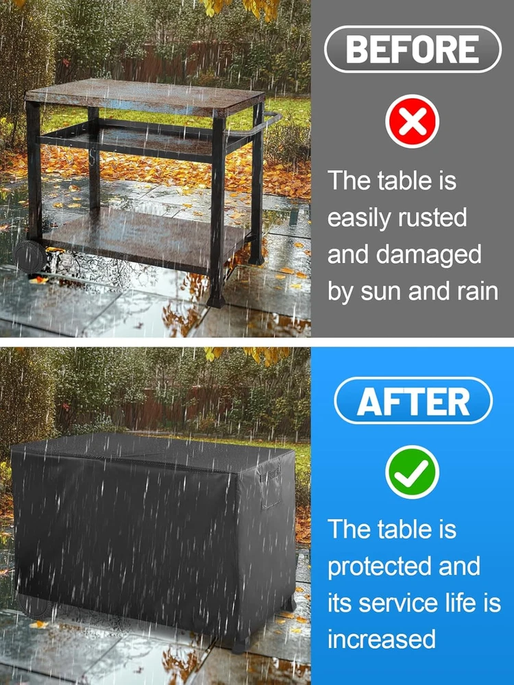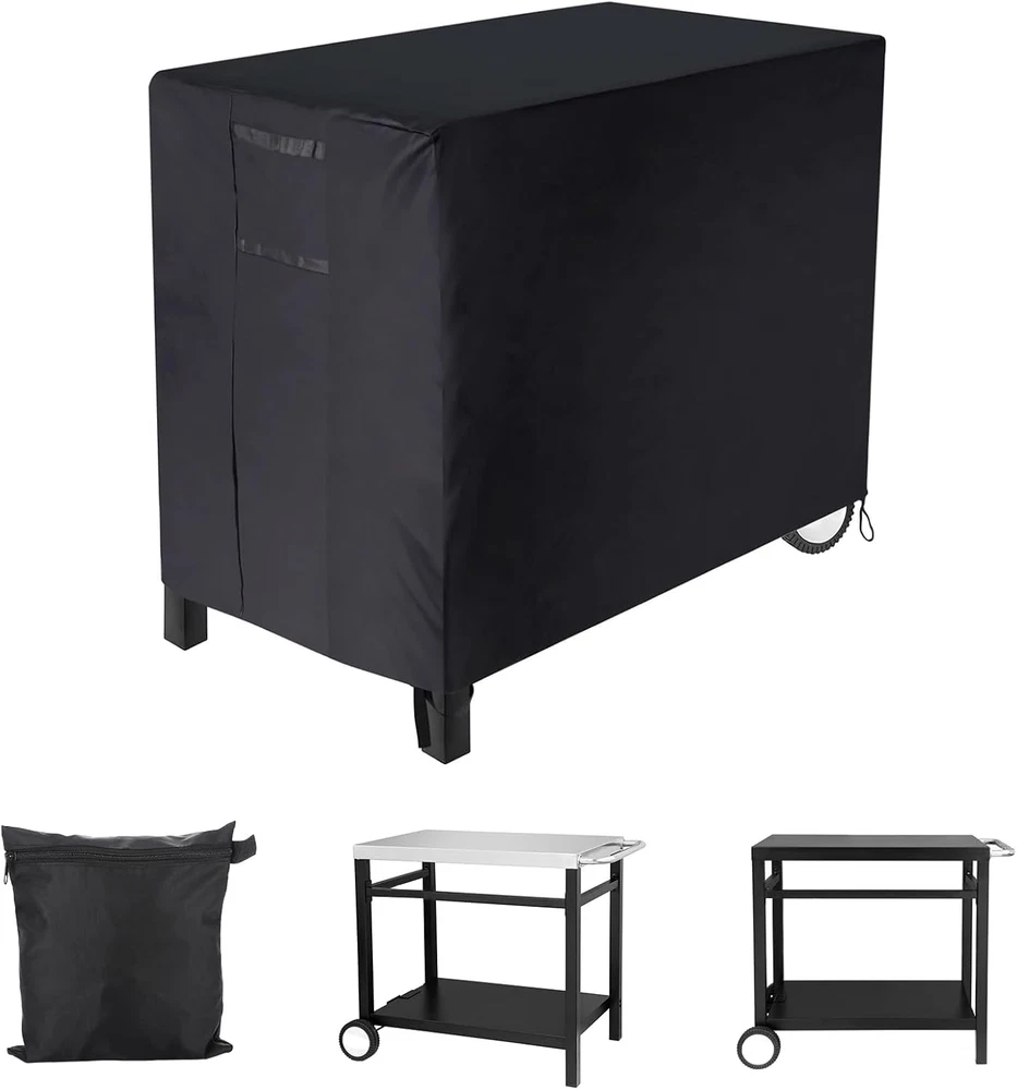 【Desirable Size】You will receive an ideal-size black outdoor prep table cover. It can be perfectly compatible with the Royal Gourmet double-shelf movable dining cart work table (model PC3401B and PC3401S). The size is measured as 40" L x 24" W x 32" H. 【Reliable Material】Made of premium 420 Oxford cloth, our dining cart cover is especially hard-wearing and keeps your worktable dustproof when not in use. It can be suitable for various weather conditions and protects your table from rain, snow, or hot sun. 【Waterproof Lining】Our cover has a PVC silver coating on the lining, which provides deeper waterproof protection for your dining cart. It can protect many hooks or screws that come with the cart from rusting. A better waterproof effect brings a better user experience. 【Thoughtful Detail】Two buckle straps that can be tied to the table legs and the drawstring at the hem allow the cover to fit snugly on the prep table and prevents the cover from being blown away in windy weather. Mesh air vents on both sides of the prep table cover effectively prevent moisture buildup. Two side handles are securely sewn to the cover and allow you to easily remove the cover from the table. 【Widely Applicable】Our prep table cover also can be compatible with furniture of similar size and used in multiple scenes, such as a bbq table, outdoor bar, outdoor prep table, outdoor prep station, grill prep station, etc. Want to provide full protection for Royal Gourmet worktable? We sincerely recommend our outdoor dining cart cover to you! Features 1. Measures 40"L x 24"W x 32"H and fits the table model PC3401B and PC3401S perfectly 2. Made of Oxford cloth, hard-wearing and keeps your table dustproof and weatherproof 3. PVC coating on the lining provides deeper waterproof protection for your dining cart 4. Two buckle straps and the drawstring allow the cover to fit snugly on the prep table 5. Mesh air vents on both sides of the prep table cover effectively prevent moisture buildup 6. Side handles are securely sewn to the cover and you can easily remove the cover from the table Specifications: Color: Black Material: 420D Oxford Cloth & PVC Silver Coating