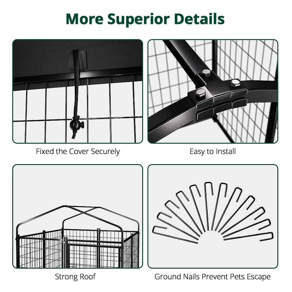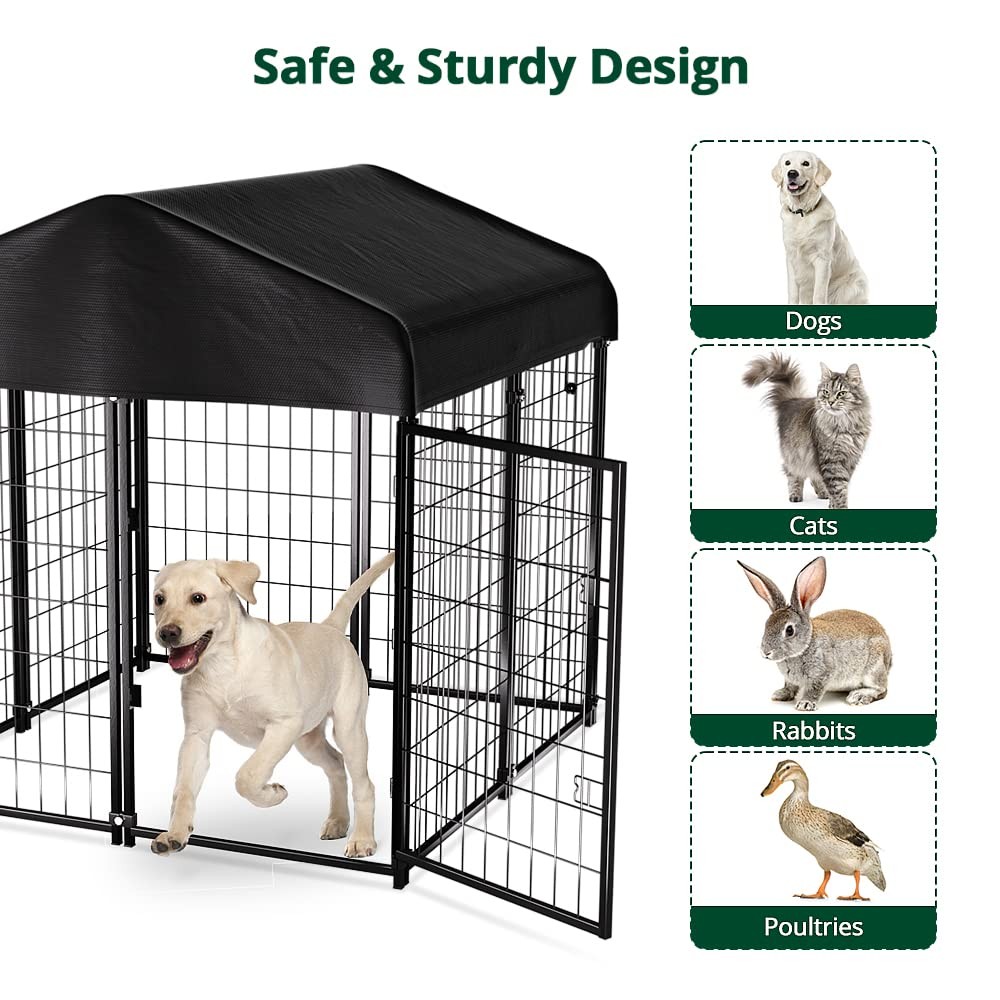 Anti-rust & Protection Design: dog cage has epoxy coating to prolong metal life, preventing rust, corrosion & fading. No need to worry about rust in rainy days. Metal surface is treated to prevent sharp edges harming pets Waterproof Removable Roof: The dog enclosure outdoor roof is made of UV-resistant and waterproof Oxford cloth, fitting outdoor dog run. Elastic ropes hold it firmly, preventing wind blow-away. The UV-resistant coating prevents fading and cracking Double door latch door: The kennel is equipped with double door locks, which are strong enough to prevent smart dogs from opening the door by themselves. Resting outdoors safely Large Interior Space: The size of the enclosures is 4ft x 4ft x 4.5ft, the right size provides ample space for your pets to rest and play in a friendly and safe environment. If you want more space, you can also connect more dog crates together Unique Design: The dog kennel has reinforced ground nails to fix the cage outdoors, preventing knockdown or movement. It's also suitable for indoor, with non-slip rubber feet to prevent floor scratching. Ideal for small/medium sized dogs within 33 lbs