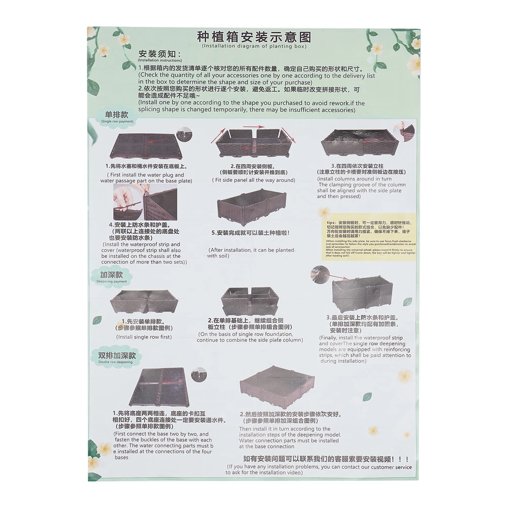 Description The 4 raised garden beds with large capacity can provide sufficient growth space to grow vegetables, plants, etc. They are made of food-grade PP, which can be used outdoors or indoors for a long time. The raised garden beds with drain holes and drain pipes that can drain excess water. They are suitable for gardens, small patios, decks, balconies, and apartments. It can be used to plant plants, vegetables, flowers, herbs, etc. Key Features Large Capacity: The 4 raised garden beds with large capacity can provide sufficient growth space to grow vegetables, plants, etc. High Durability: The raised garden beds are made of food-grade PP, which can be used outdoors or indoors for a long time. Comfortable Gardening: The raised garden beds will bring you a comfortable gardening exper Outdoor Elevated Raised Garden Bed Planter Box with Legs for Vegetable/Flower Description~ Description The 4 raised garden beds with large capacity can provide sufficient growth space to grow vegetables, plants, etc. They are made of food-grade PP, which can be used outdoors or indoors for a long time. The raised garden beds with drain holes and drain pipes that can drain excess water. They are suitable for gardens, small patios, decks, balconies, and apartments. It can be used to plant plants, vegetables, flowers, herbs, etc. Key Features Large Capacity: The 4 raised garden beds with large capacity can provide sufficient growth space to grow vegetables, plants, etc. High Durability: The raised garden beds are made of food-grade PP, which can be used outdoors or indoors for a long time. Comfortable Gardening: The raised garden beds will bring you a comfortable gardening experience, alleviating the need to bend while protecting your plants from disturbing by wild animals. Drain Holes and Pipes: The raised garden beds with drain holes and drain pipes drain excess water and help plants fully absorb water and nutrients. Easy to Assemble: You can easily install them by putting the frames and sheets together without much effort and time. Wide Application: The raised garden beds can be placed on many occasions such as in gardens, small patios, decks, balconies, and apartments. It can be used to plant plants, vegetables, flowers, herbs, etc. Light Weight: The raised garden beds are light enough to be placed anywhere you want, facilitating your daily gardening. Guaranteed After-sales Service : We aim to provide quality products and services, if you have any problems, please feel free to contact us, we will reply and solve the problem for you as soon as possible. Details Plastic Material: The raised garden beds are made of food-grade PP with good toughness, so they are more durable and can be used for a long time both indoors and outdoors. Drain Holes: The raised garden beds have drain holes that can effectively drain excess water. Application The raised garden beds are suitable for gardens, small patios, decks, balconies, and apartments. It can be used to plant plants, vegetables, flowers, herbs, etc. Specification Material: PP Color: Brown Quantity: 4 Each Product Size: 39*39*38cm/15.35*15.35*14.96in Four Combined Sizes: 156*39*38cm/61.41*15.35*14.96in Package Included 4* Raised Garden Beds Notes 1. Please put enough soil in the garden box first, otherwise it will not stand stable. 2. Please allow the slight color difference caused by the shooting light and 1-3cm error due to manual measurement, and make sure you do not mind before ordering. Payment Delivery details Terms of sales About us Contact us Payment We accept ebay payment 。 Fees such as import duties, taxes are not included in the item price or shipping costs. These charges are the buyer's responsibility. Delivery details Shipping: 2-9 working days to: USA Terms of sales We maintain high standards of excellence and strive for hundred percent customer satisfaction. Feedback is very important to us. We hope that you contact us immediately before you give neutral or negative feedback, so that we can address your concerns. It is impossible to address issues if we do not know about them! About us Your satis faction is our ultimate goal. We work hard to earn your trust and future business. Our certified technicians have tested each item before shipping. The unit comes with 1 year limited warranty on all manufacturing defects. a) If you receive a defective item, you may return it or ask for a discount. Please contact us within 14 days after you receive the package. b) What you returned must be intact and in its original packaging as re? u. Customer is responsible for shipping costs of the returned item. c) We will cover the cost of shipping back t with the shipping rate indicated in the registration page. We will send you a new unit or refund the full payment you paid. Thank you. Contact us Business Hour Business Hour: Monday To Friday: 8:30 AM to 5:00 PM (Beijing China time) Due to time zones, our reply to your questions may not be immediately. But within above working time, we will reply your email within 24 hours. If it's non-workdays, please kindly be patient and wait till Monday. Please contact us with ebay message. Please feel free to contact us if you have any questions. Monday To Friday: 8:30 AM to 5:00 PM (Beijing China time) Due to time zones, our reply to your questions may not be immediately. But within above working time, we will reply your email within 24 hours. If it's non-workdays, please kindly be patient and wait till Monday. Please contact us with ebay message. Please feel free to contact us if you have any questions.