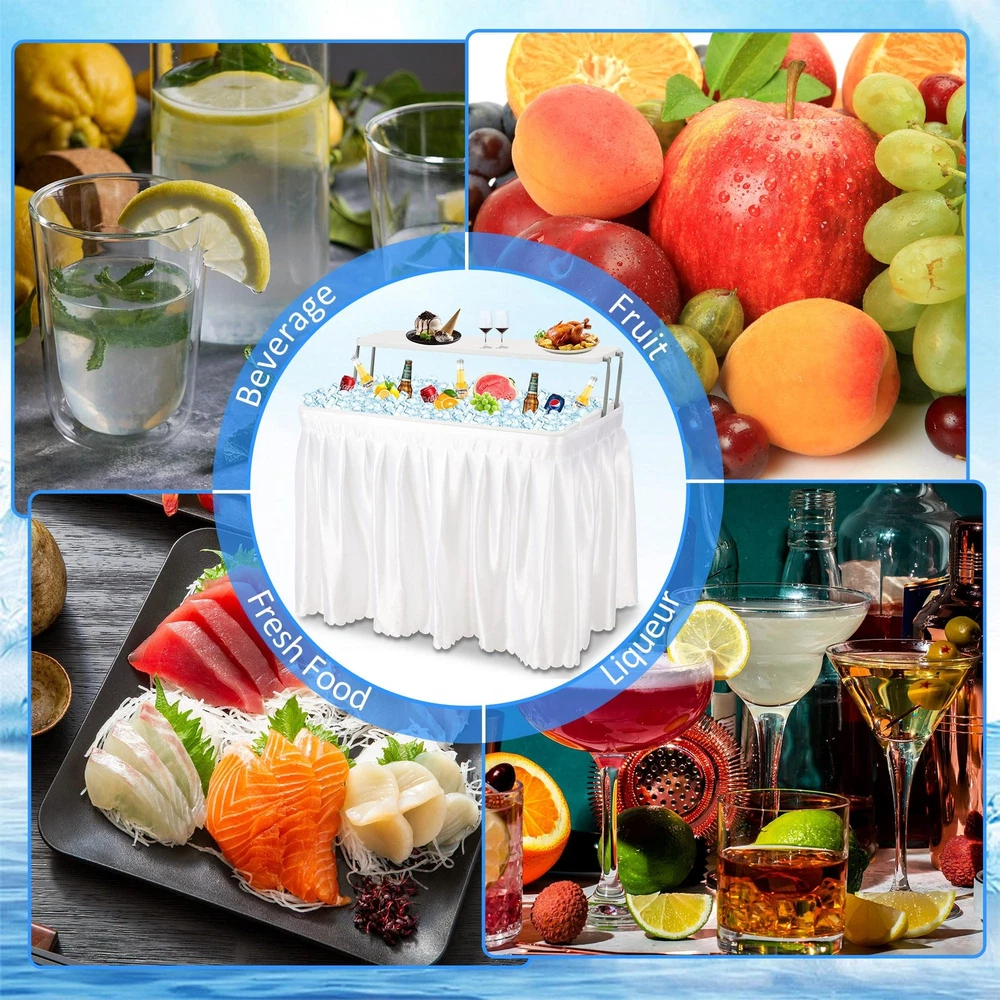 TWO LAYERS Ice Cooler Folding Table for Party 🧊DOUBLE TIER 2 IN 1: Elevated model upgraded double-tier design ice table with top stand for party foods that don't need refrigeration for storage, and table slots as ice storage for food coolers. Novel and unique shape coexists with practicality, cost-effective choice! 🧊FOLDING PORTABLE: This 4 Ft ice cooler table folds with stainless steel rigid legs that lock into place and won't pop open during transportation, and a carry handle for easy landing. 🧊EASY CLEANING AND DRAINING: Our party tables with drain prevents water from pooling, and the HDPE surface resists dirt and stains and cleans up in one wipe, reducing labor costs. 🧊REMOVABLE SKIRT AND METAL HOLDER: The drink cooler table comes with a skirt and velcro fasteners, and the faux satin sheen adds an elegant and classy vibe to your party. The metal shelf adds extra storage space and can be hidden under the skirt. 🧊READY-TO-USE SPACIOUS TABLETOP: This outdoor food keeper uses a 3.5" deep, 22"×40" large tabletop to allow users to store large amounts of ice to keep beverages, fruits, and cold foods chilled for an extended period of time. 🧊MADE FOR LONG USE: Our ice cooler folding table is made of stainless steel legs and HDPE surface, which is resistant to corrosion, rust, cold and pressure. The triangular support structure of the legs makes the whole not easy to deform and break. Suitable for weddings, parties, picnics, camping trips, BBQ, fishing, etc., indoor and outdoor universal.